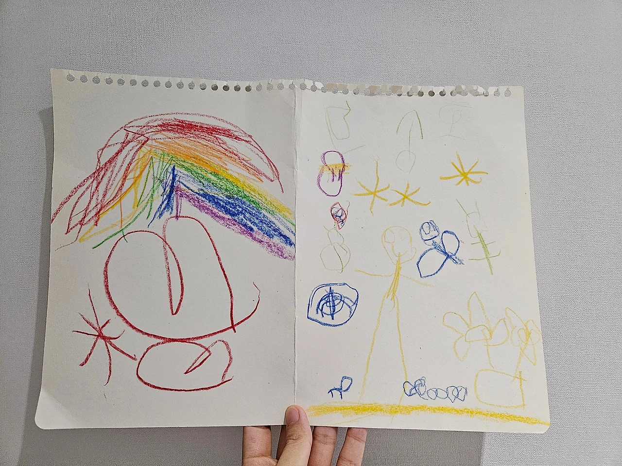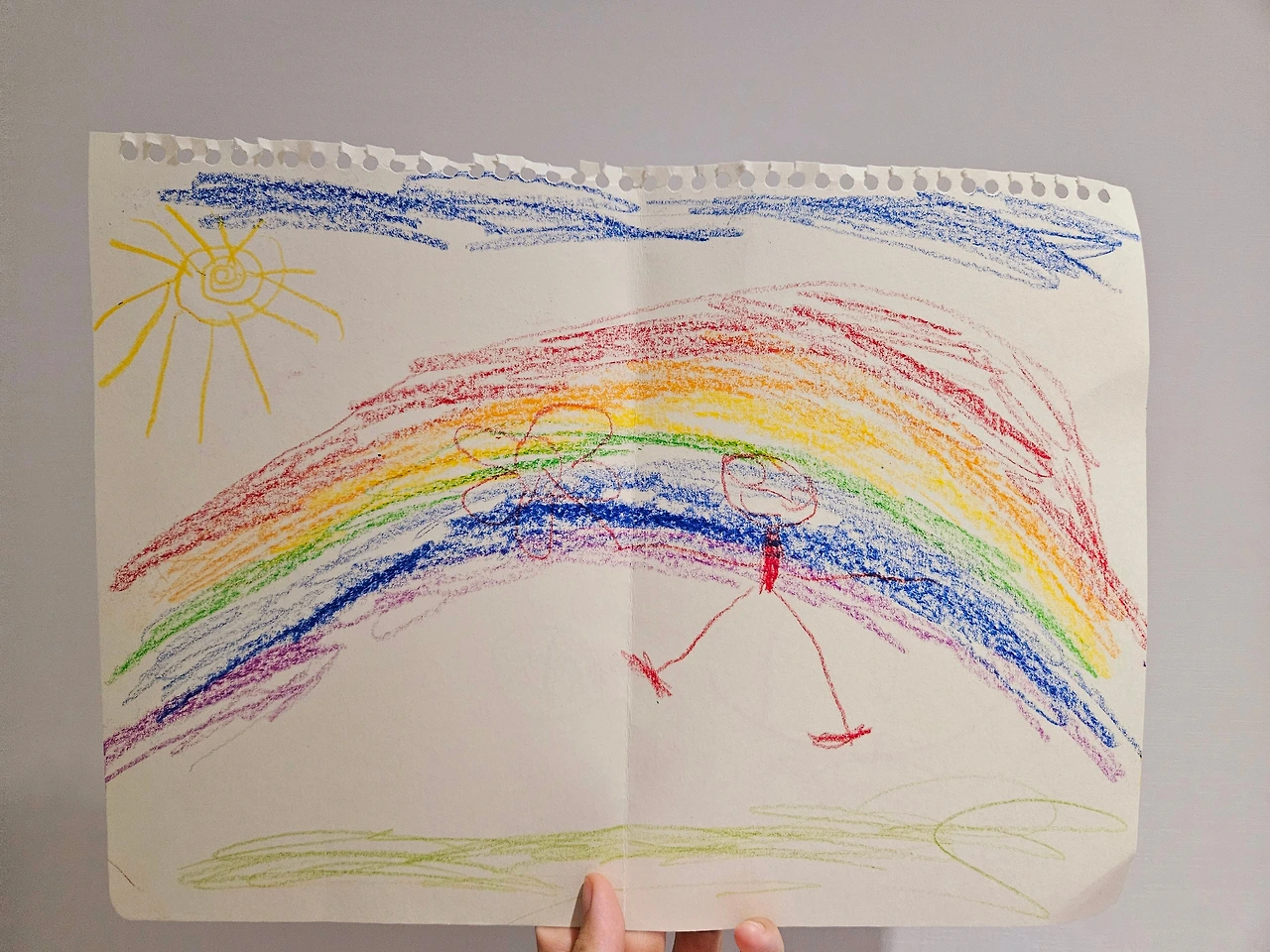 아침부터 둘째가 작은 방에 엎드려 그림을 그린다. 얼마 뒤 꽃을 타고 무지개로 날아가는 엄마를 그렸다며 선물해 준다.