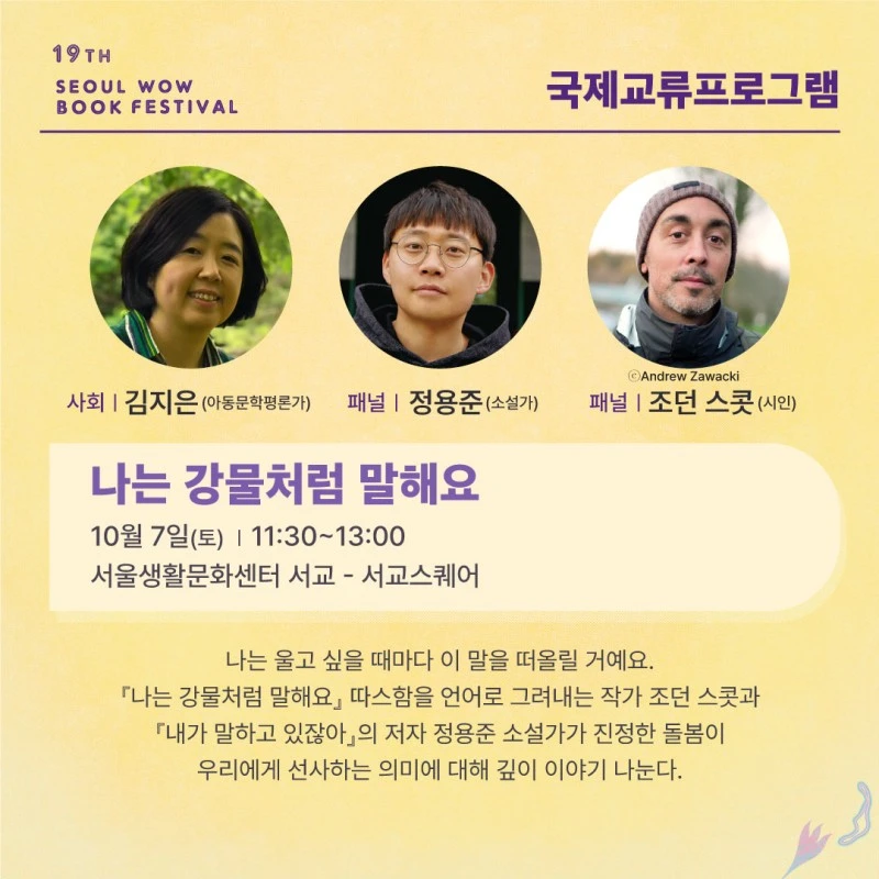 <강물처럼 말해요>라는 그림책을 좋아해서 신청한 프로그램이었는데, 이 책을 비롯해 수많은 그림책들을 번역하시고 아동문학평론을 하시는 김지은 평론가님께서 사회를, 여러 문학상을 받으시고 현재 서울예대에서 문학을 가르치시는 소설가 정용준님께서 또 다른 패널로 나오셨다.