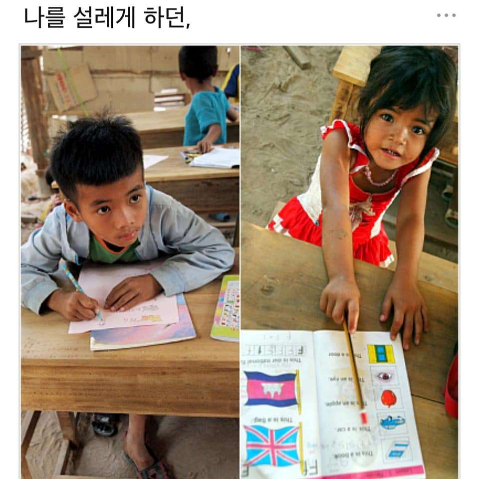 그와 반대의 경험을 한 것은 친구와 함께 배낭여행으로 떠났던 캄보디아에서였다. 앙코르와트가 있는 씨엔립의 숙소에서 김형욱 작가님을 만나게 되어 작가님이 돕고 있는 근처 학교를 방문하게 된 것이다. 학교라고는 했지만, 지푸라기로 만든 지붕 아래 흙바닥 위에 책걸상이 몇 개 놓여 있는 것이 다였다. 그런 교실 환경에서는 비바람이 불면 당연히 수업이 어려웠고, 많은 아이들은 맨발로 교실 안팎을 뛰어다니고 있었다. 학교에 교사와 교재 등이 부족하다는 얘기를 듣고, 나는 친구와 함께 상의하여 여행 일정을 조정하여 캄보디아에 있는 동안 매일 아이들을 가르치게 되었다. 기념품을 사려고 했던 돈으로 아이들의 책과 연필, 지우개 등 문구류를 샀고, 여행 경비 중 일부를 덜어 아이들을 위한 특식으로 스파게티 재료 등을 구입하였다.