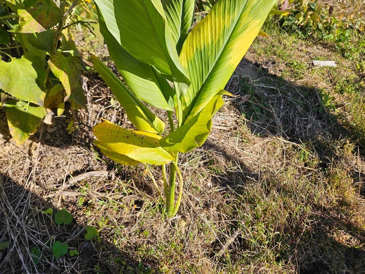 지난 4월 말에 엄지 한 마디 정도 크기로 잘라서 흙 속에 묻어둔 강황은 마치 바나나 잎이나 열대식물의 잎처럼 넓은 잎을 뻗어내고 있었다.