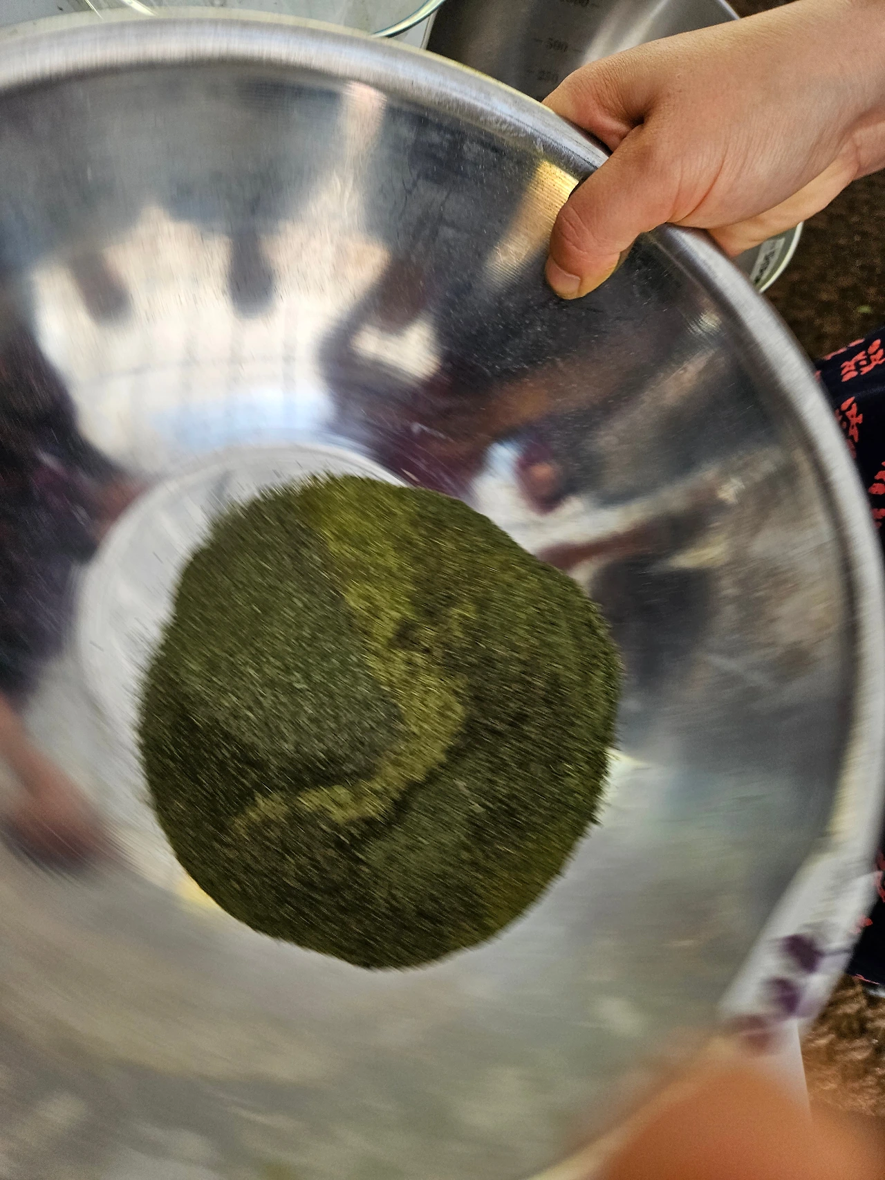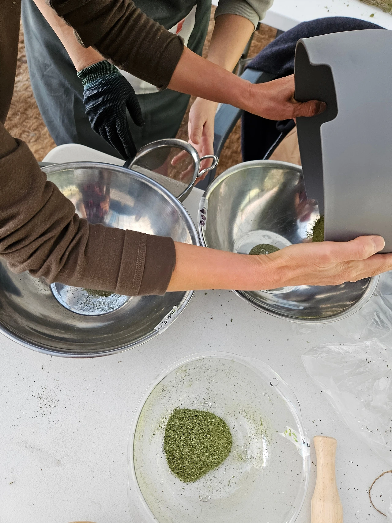 그를 위해 가장 먼저 수강생분들과 함께 2주 전 수확해서 말려둔 허브들을 각 종류별로 절구에 넣고 빻고 간 뒤 체를 쳐서 고운 입자로 만들었다. 그 뒤에 민트류를 베이스로 염증에 좋은 톱풀, 간이나 피로해소에 좋은 타임, 감기에 좋은 히솝 등의 허브를 아래와 같은 비율로 섞었다.