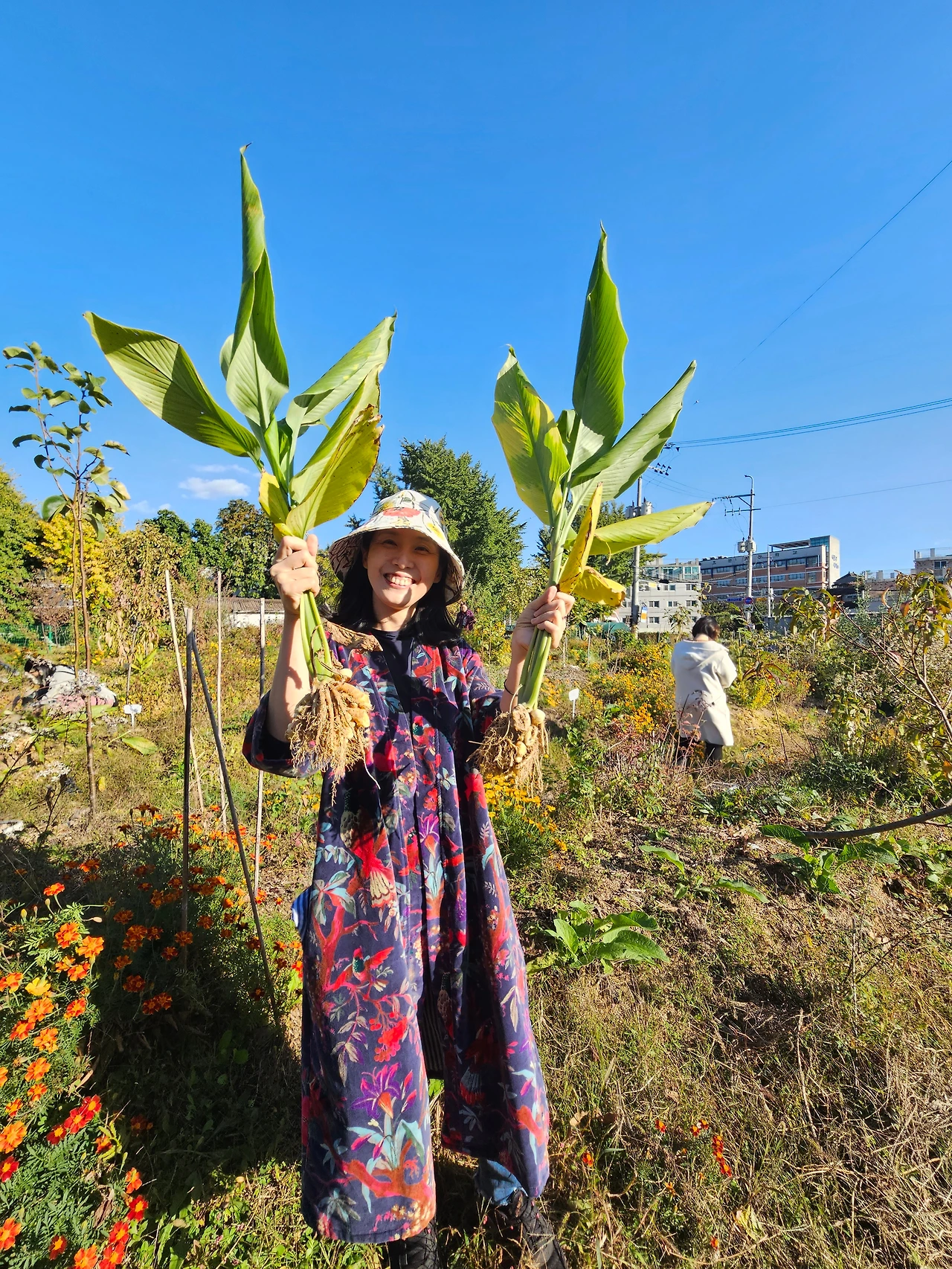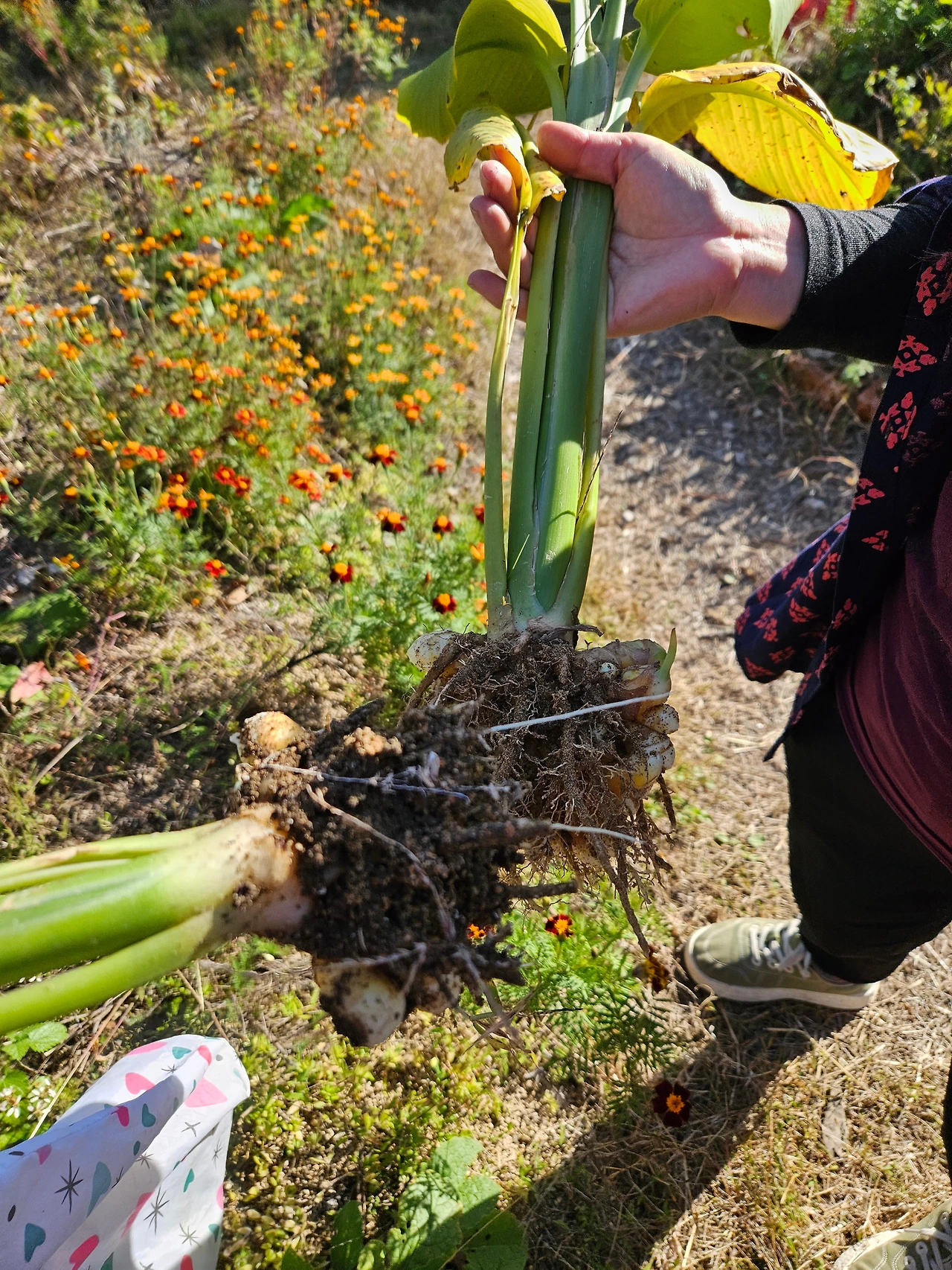 소란 선생님께서 오늘은 강황을 수확하자고 하시더니 강황 줄기 아랫부분을 두 손으로 잡고 뽑으라고 하셨다. 그렇게 강황 줄기들을 뽑는데, 땅속에서부터 무언가가 쑤~욱 당겨져 나오는 느낌이 너무나 재미있었다. 마치 팽팽한 줄다리기 끝에 우리 쪽으로 줄이 당겨져 올 때의 쾌감 비슷한 것이 느껴졌다.