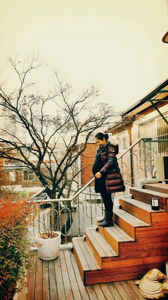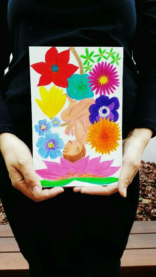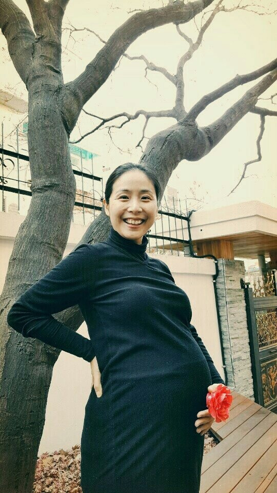 당시 살던 집 마당에서, 내가 그린 그림과 꽃을 들고 찍은 만삭 사진 '엄마'가 된다는 것은 정말인지 '어마어마'한 일이었다. 생각지도 못했던 입덧에 한동안 밥을 먹지 못해도 배는 계속 불러왔다. 그래도 내가 선택한 엄마의 길이라, 나는 그 변화들에도 적응하고자 했다. 가능한 매일 자연 속을 고요히 걸으며, 아이에게 말을 걸고, 이 세상의 아름다움을 미리 알려주고자 했다.