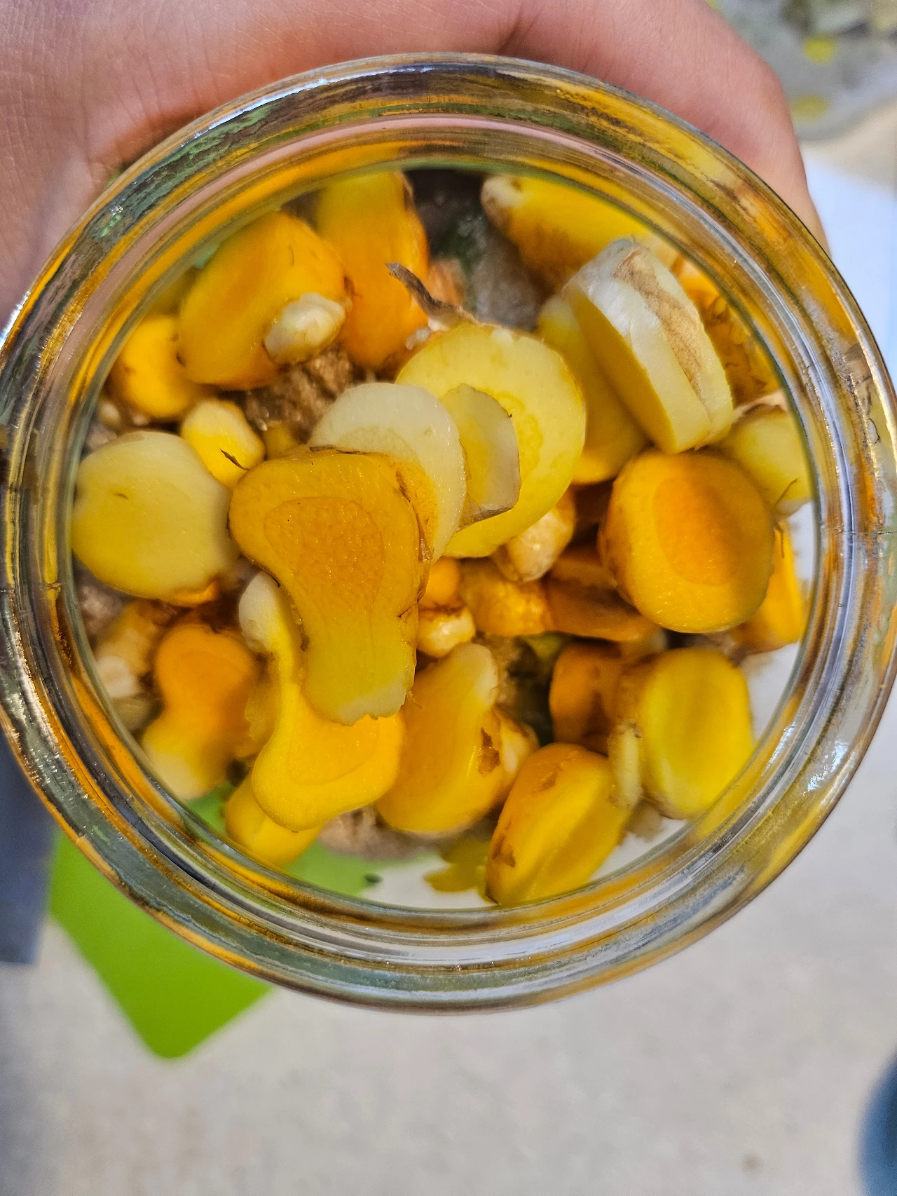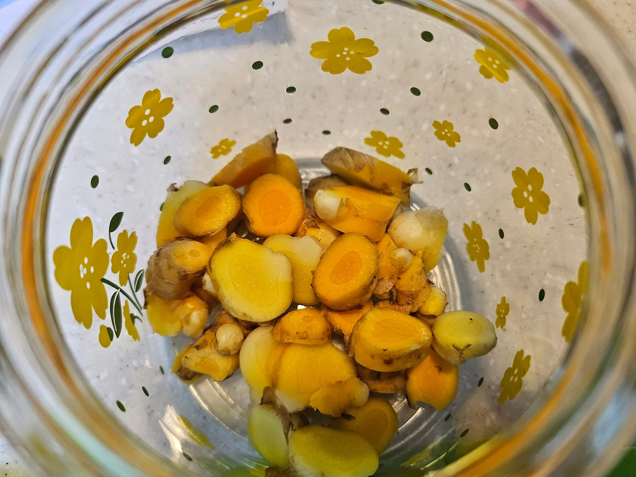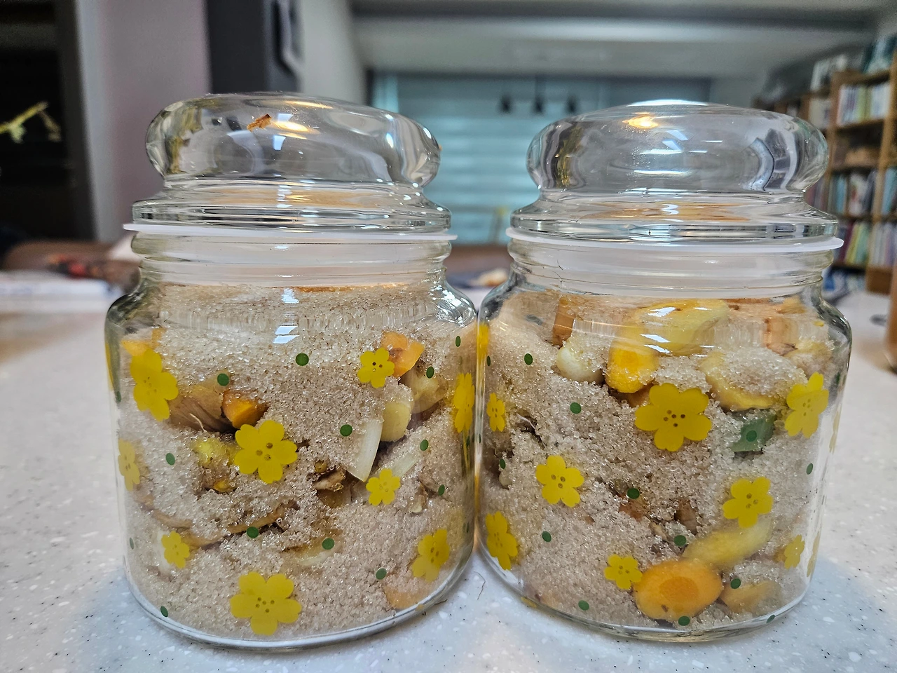 나는 귀여운 노란빛 꽃들이 새겨진 유리병 두 개를 꺼내서 끓는 물에 소독하여 말려둔다. 그 사이 강황에 붙어있는 흙덩이들도 깨끗이 씻어낸다. 흐르는 물에 엉켜있던 잔뿌리들이 가지런해진다. 체반에 씻은 강황 줄기 밑둥과 뿌리들을 잘 담아두고선 찬장 속 유기농 설탕을 꺼낸다.