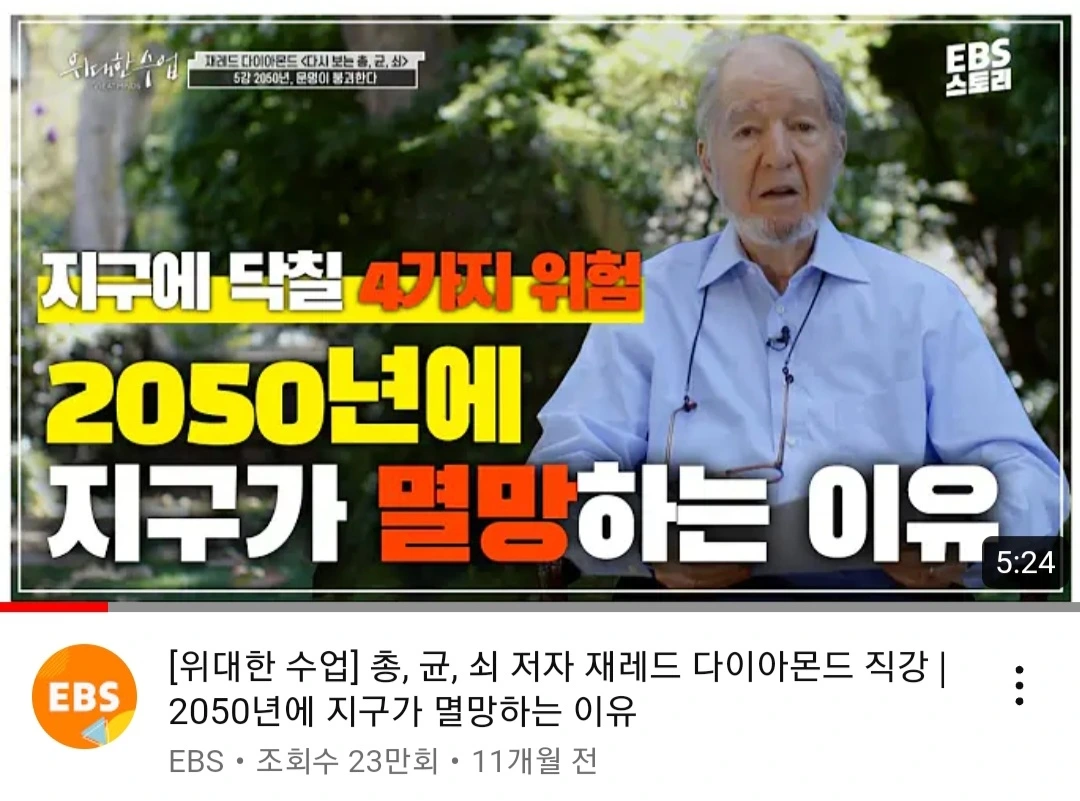 마침 어제 <총, 균, 쇠>의 저자인 제래드 다이아몬드의 강의를 들어서인지 마음이 더 뒤숭숭하다. 그를 비롯한 여러 학자들은 기후위기, 자원고갈 등으로 이대로 가다가는 2050년 정도에 큰 위기가 올 거라 경고한다. 이처럼 인류의 종말은 가까운 미래로 예견되고 있지만, 우리의 생활에는 거의 변화가 없고, 뚜렷한 대책도 보이지가 않는다.