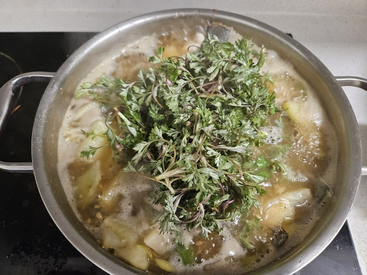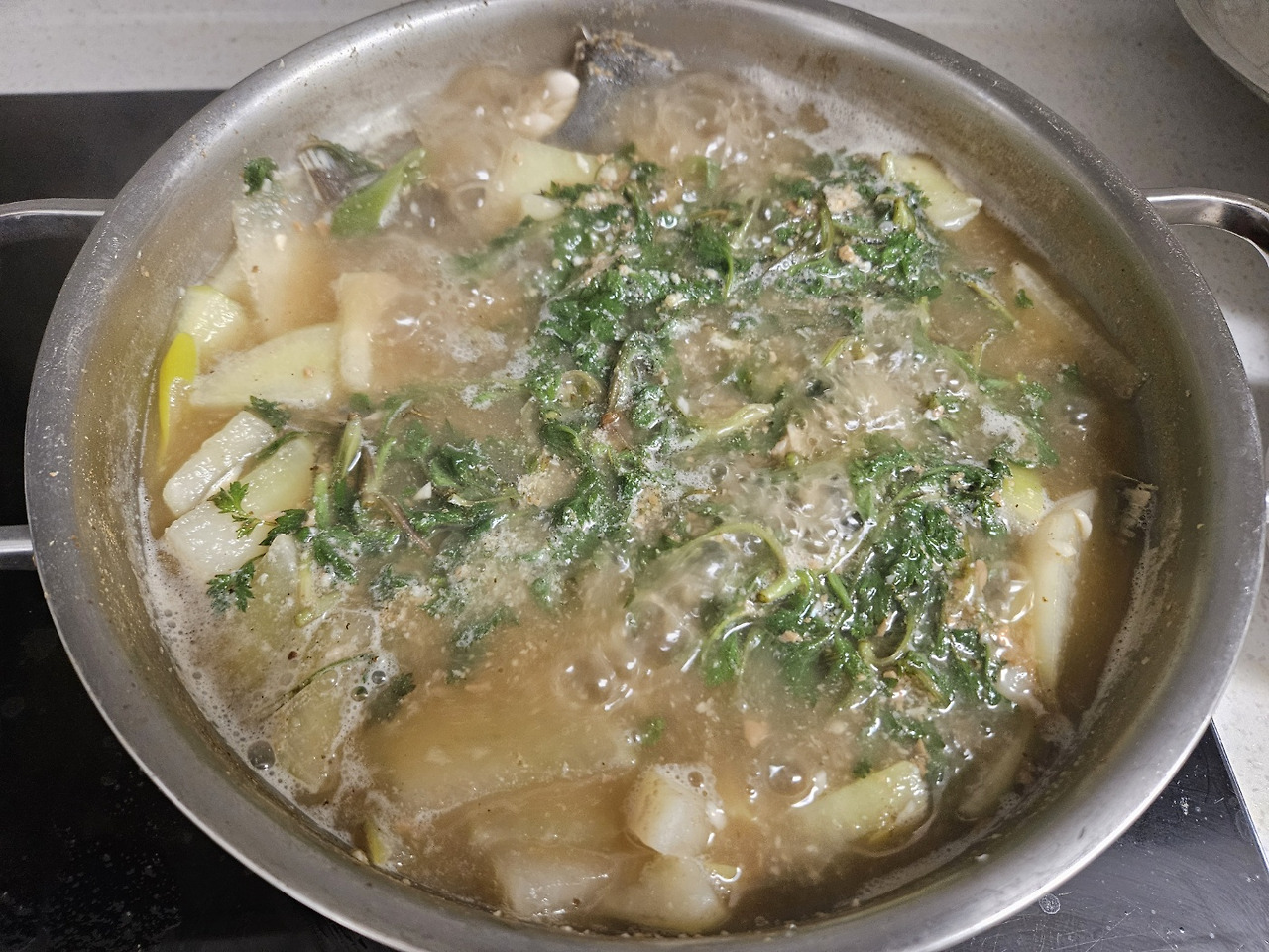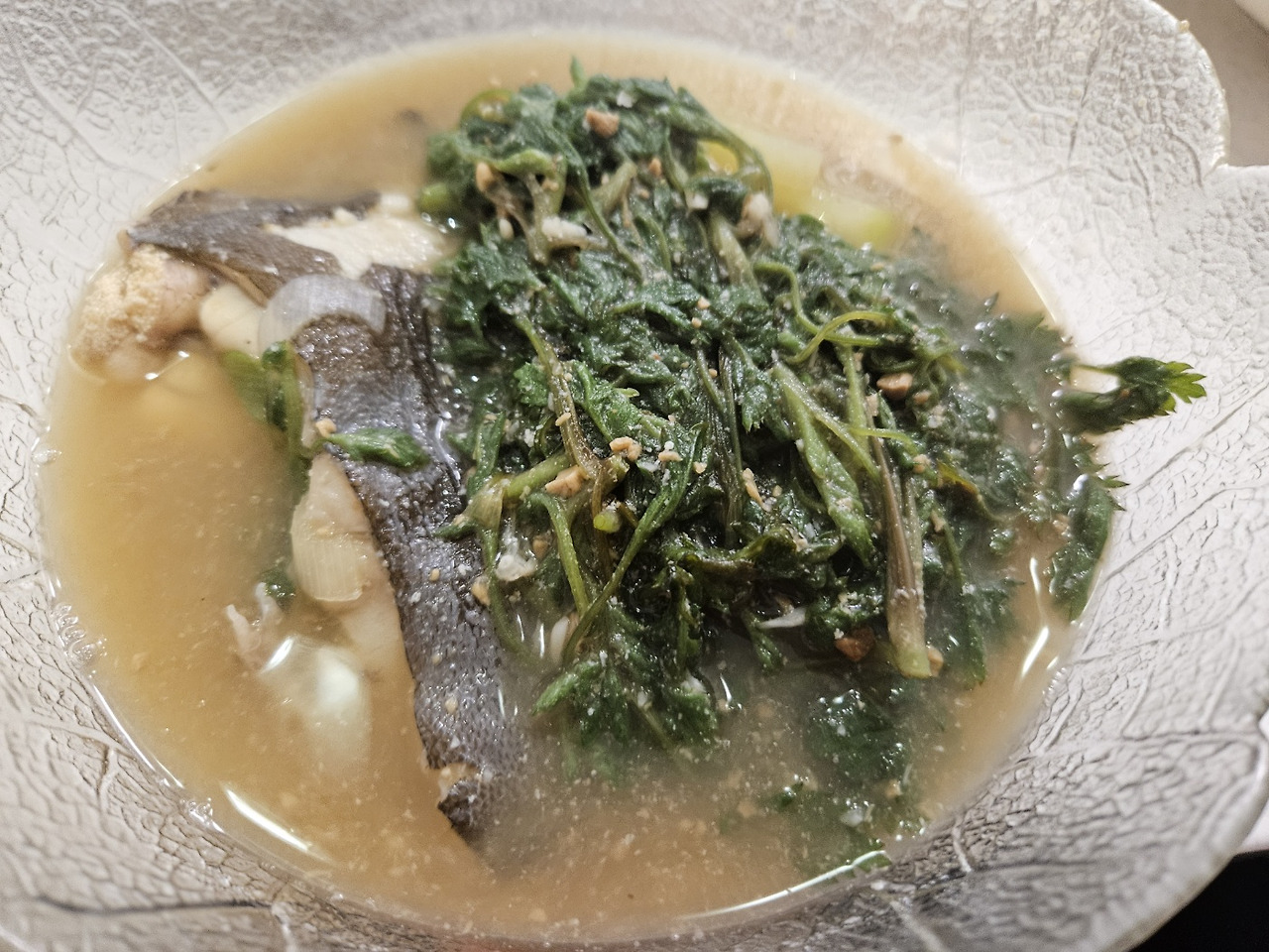 도다리살이 뽀얗게 익었을 때 쑥을 한 움큼 넣고, 냄비 뚜껑을 닫고 불을 끈다. 30초-1분쯤 뒤에 뚜껑을 열면 쑥이 숨이 죽어 국에 스며들어있는 것을 확인하고 먹으면 된다. 취향에 따라 대파나 두부를 추가해서 썰어 넣어도 좋다. 마지막으로 들깨가루를 살짝 부려먹으면 더 고소하고 깊은 맛이 난다.