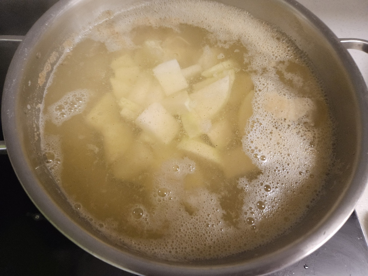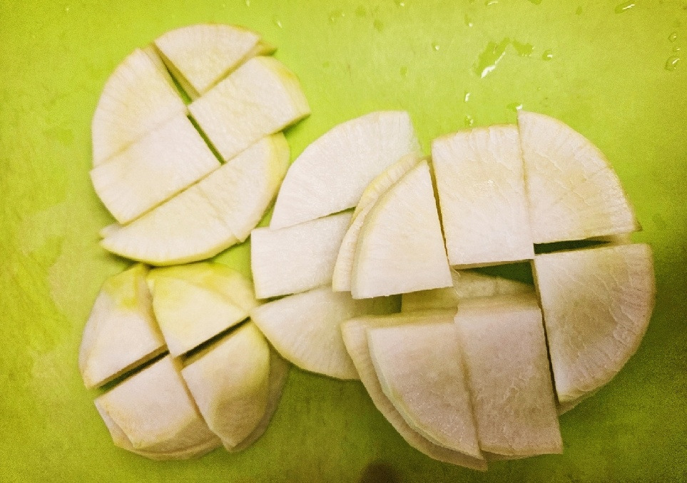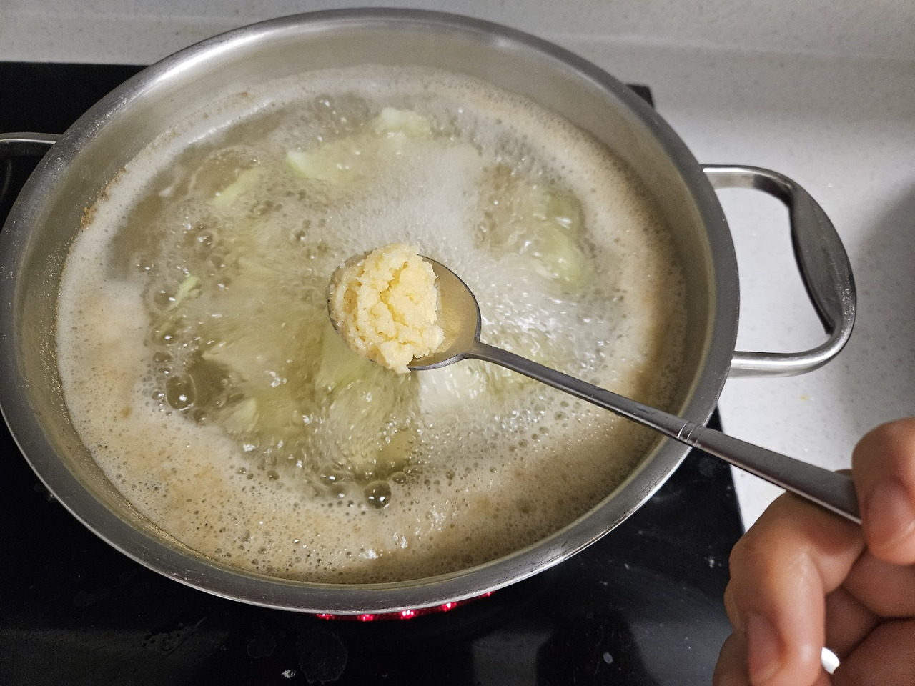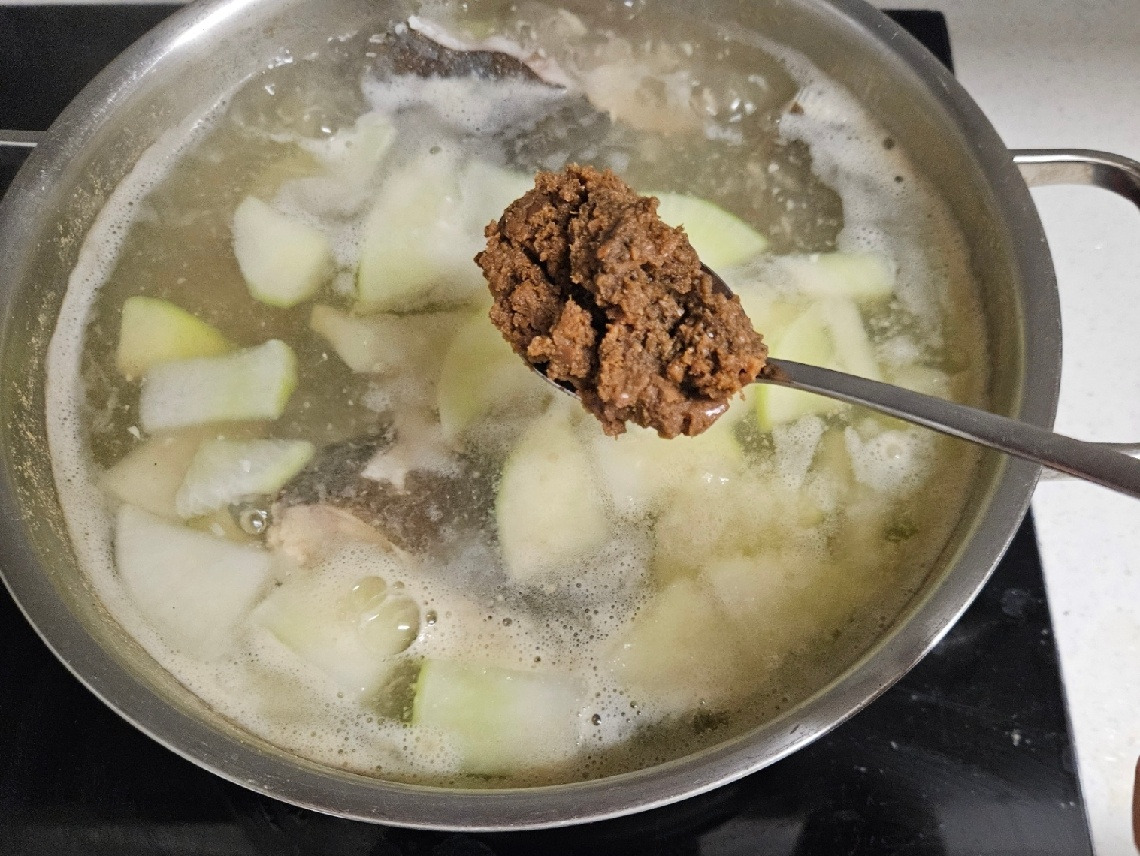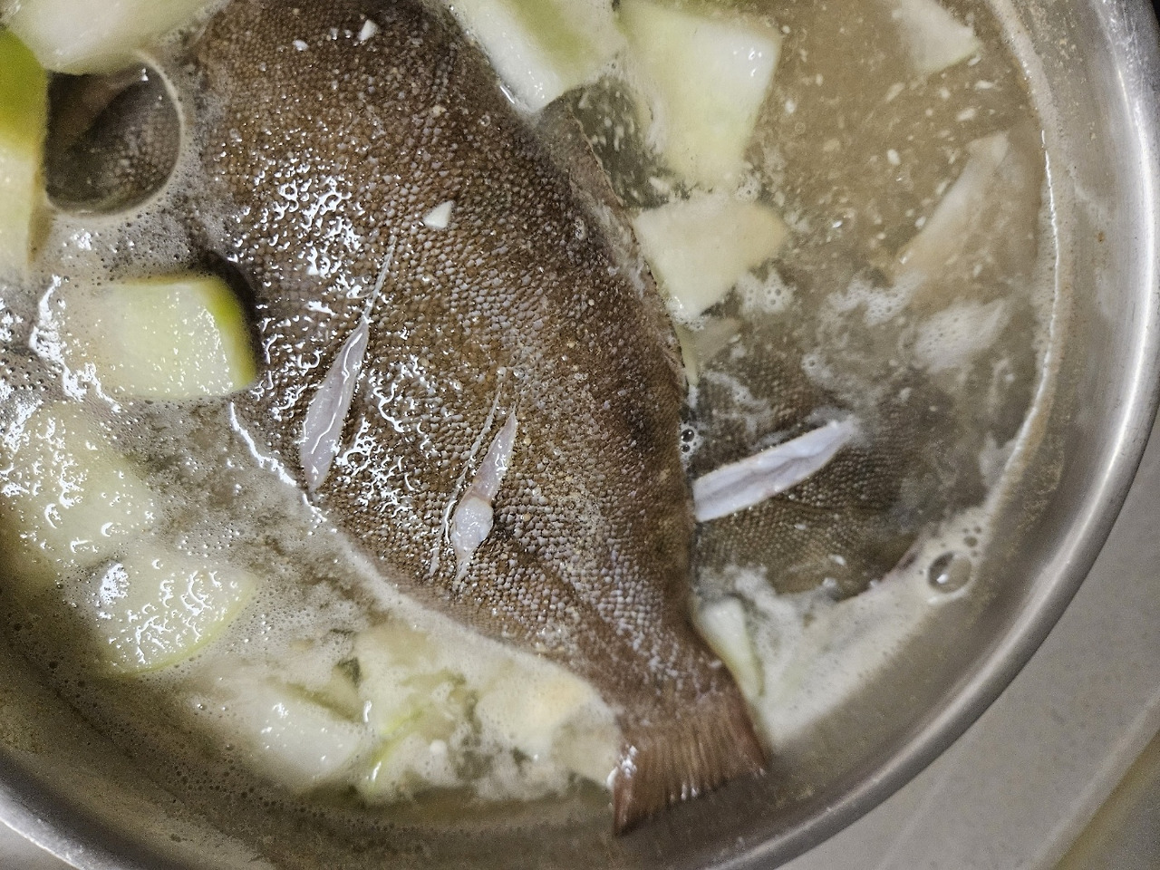 먼저 넓은 냄비에 물을 담아 알육수를 넣어 끓여 육수를 만들고, 무를 썰어 넣어 끓어오르면 비닐과 지느러미, 머리를 제거하여 손질하여 칼집을 낸 도다리를 넣은 뒤, 된장과 다진 마늘 등을 적당량 풀어준다.