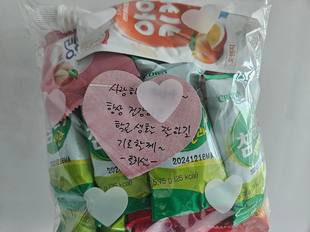 아이는 콧노래를 흥얼거리며 자신이 받은 과자와 간식 선물들을 정리하다가 문득