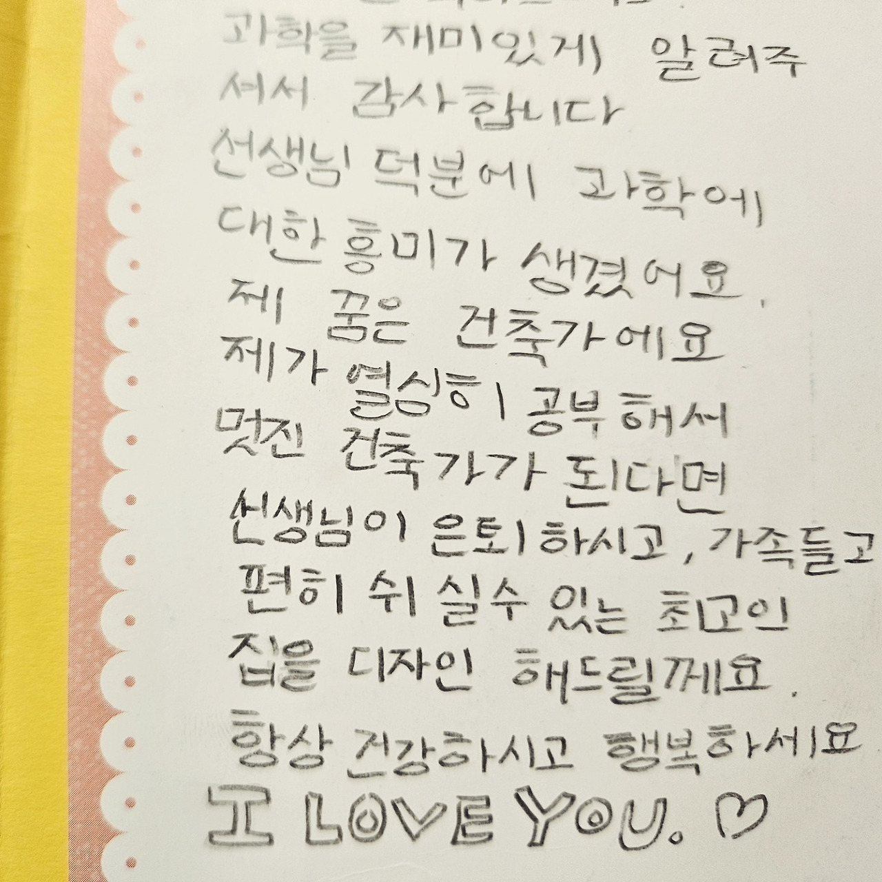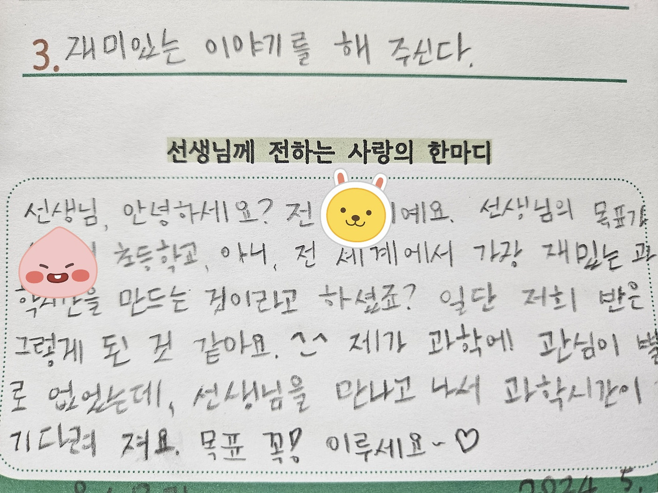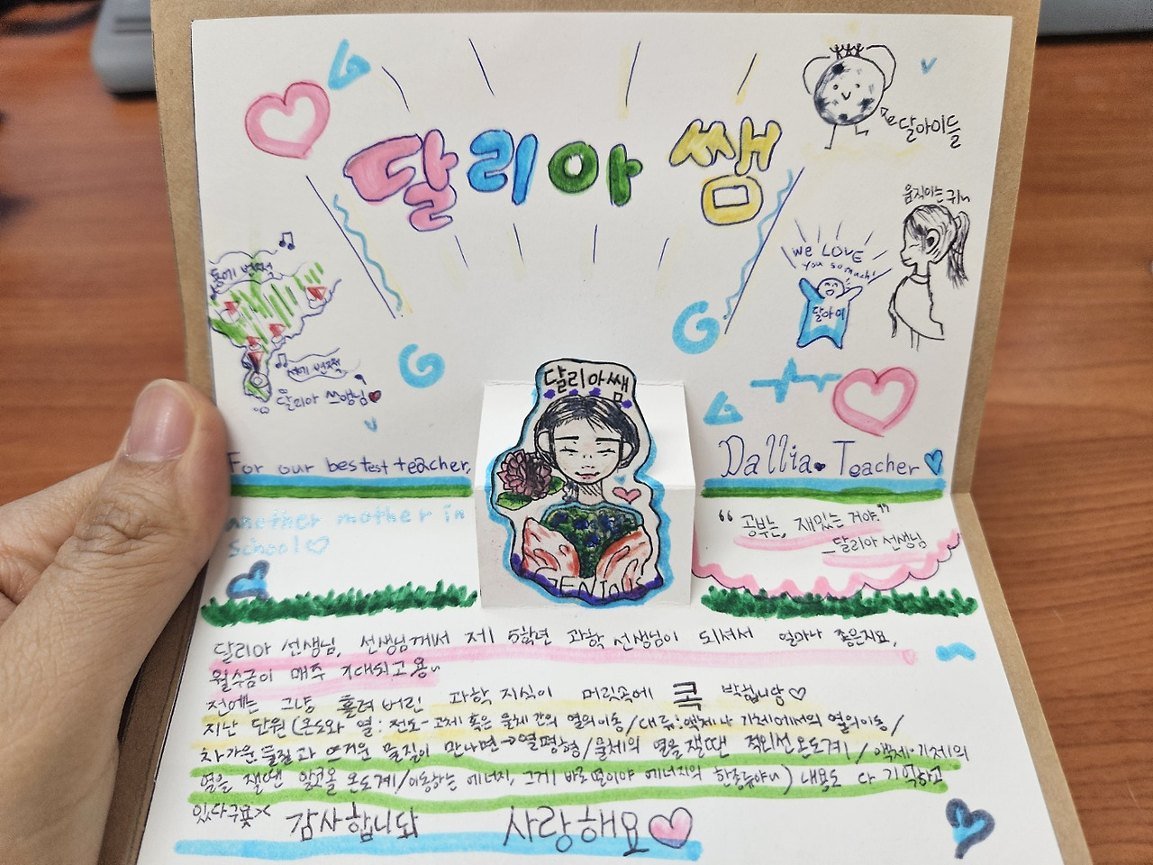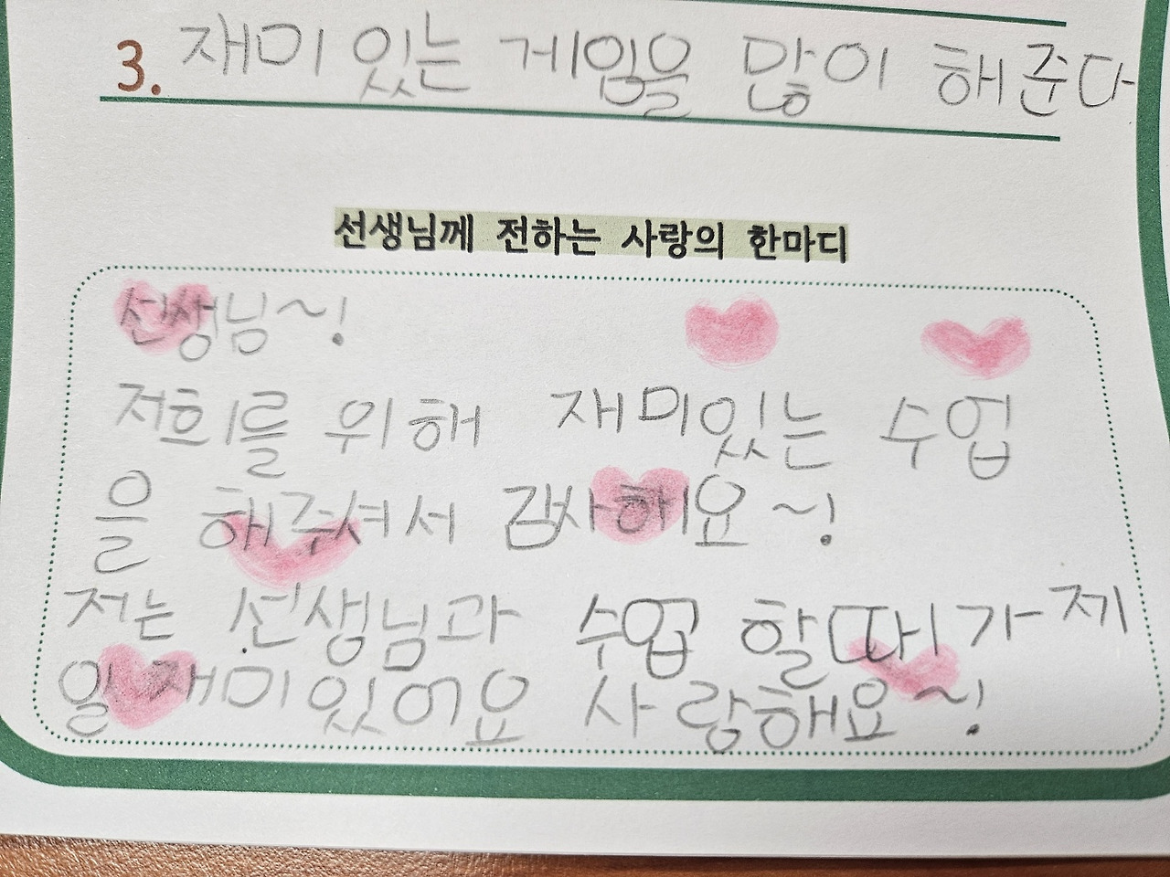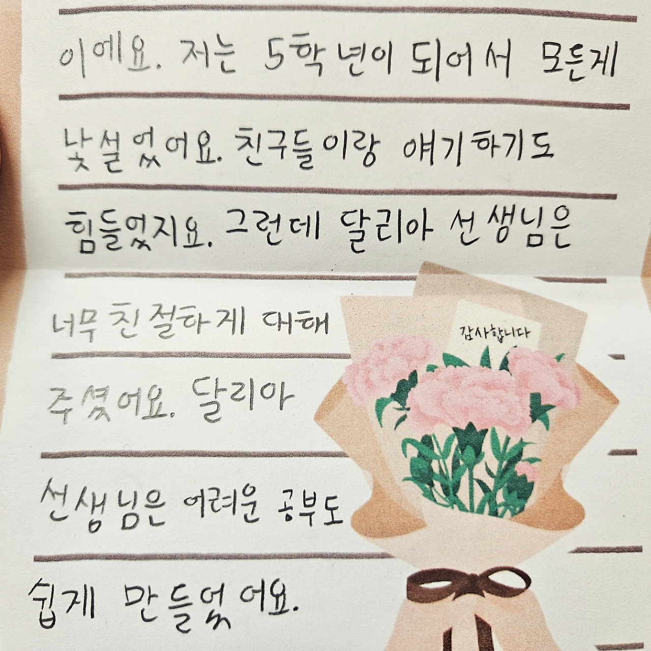 수업 후에는 아이들이 써 준 편지를 읽는데, 또 한 번 뭉클한 감격이 느껴지기도 하고, “하하하” 웃음이 나기도 했다. 아이들의 글 속에는 순수하고도, 다정하고, 따뜻한 마음이 가득 담겨있었다. 그리고 그런 아이들에게 앞으로 더 많은 것들을 가르쳐 주고 싶다는 생각이 들었다.