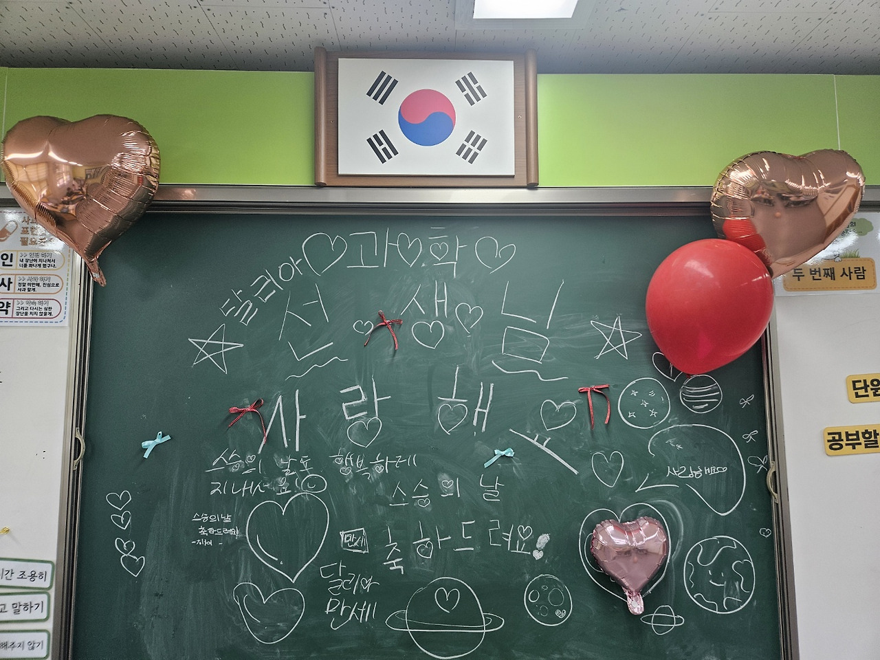 더군다나 나는 담임이 아닌 교과를 가르치는 교사라 전혀 기대를 하지 않고 스승의 날 수업을 하러 갔는데, 교실에 불이 꺼져있었다. 체육 수업을 갔다가 아직 안 왔나 싶었는데, 문을 열자 스승의 은혜 반주가 나오며 반아이들이 입을 모아 목청껏 노래를 불렀다. 칠판의 감사 메시지와 풍선과 아이들이 전해준 편지 더미에 나는 나도 모르게 왈칵 눈물이 솟았다. 교사로 살아간다는 것의 의미를 새삼 다시 느끼며, ‘나 역시 어떤 위로와 응원이 필요했었구나!’ 하는 마음이 들었다. 사랑을 주고, 또 받는 기쁨이 가슴 가득 차올랐다.