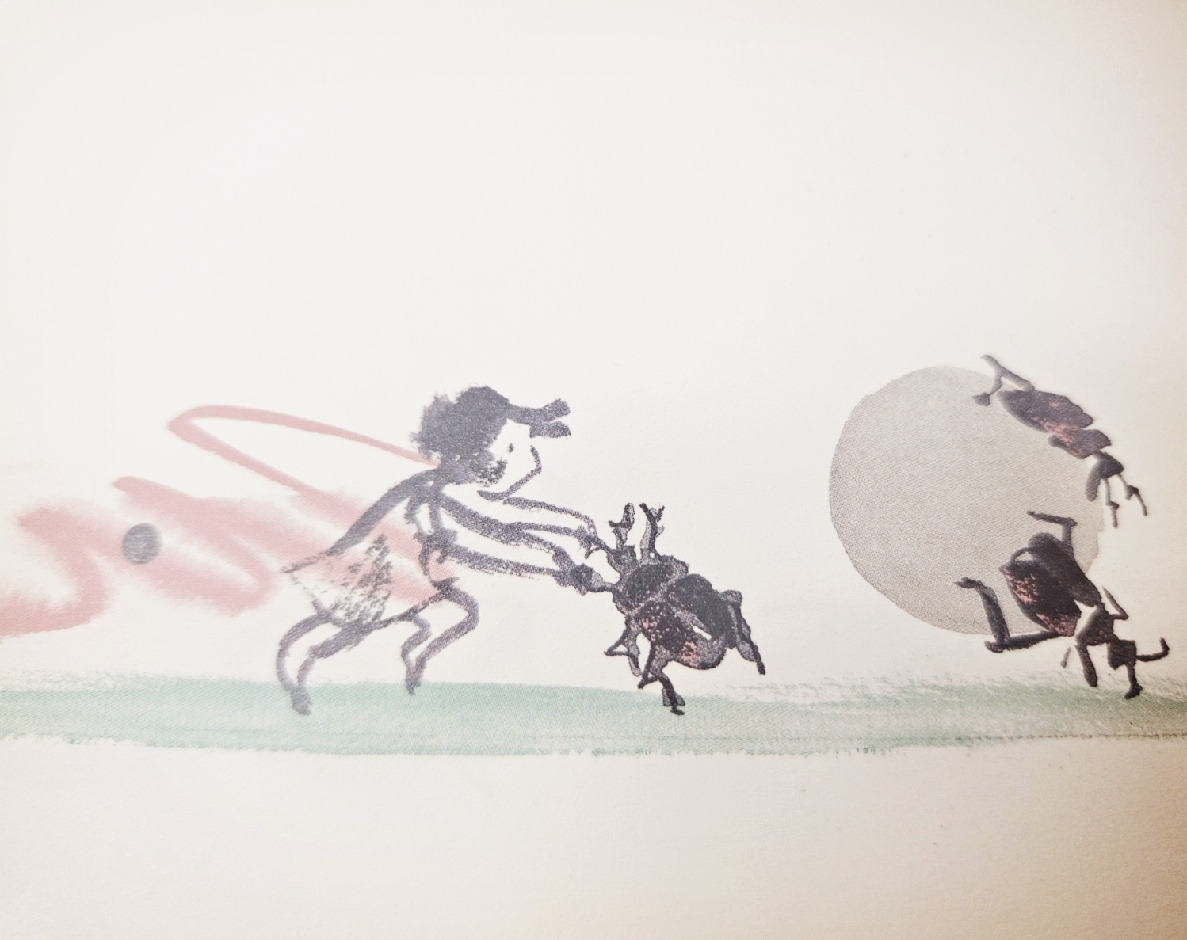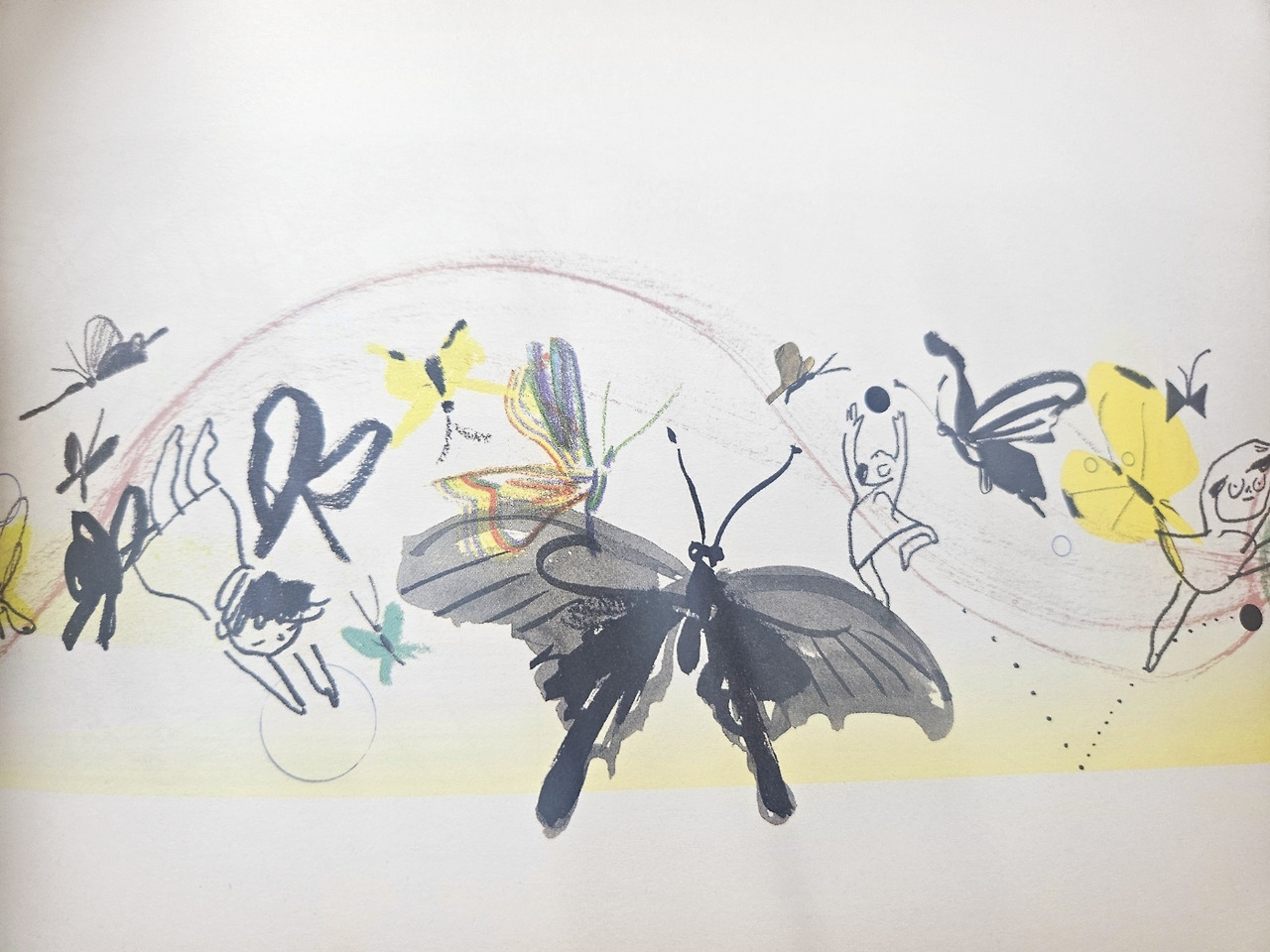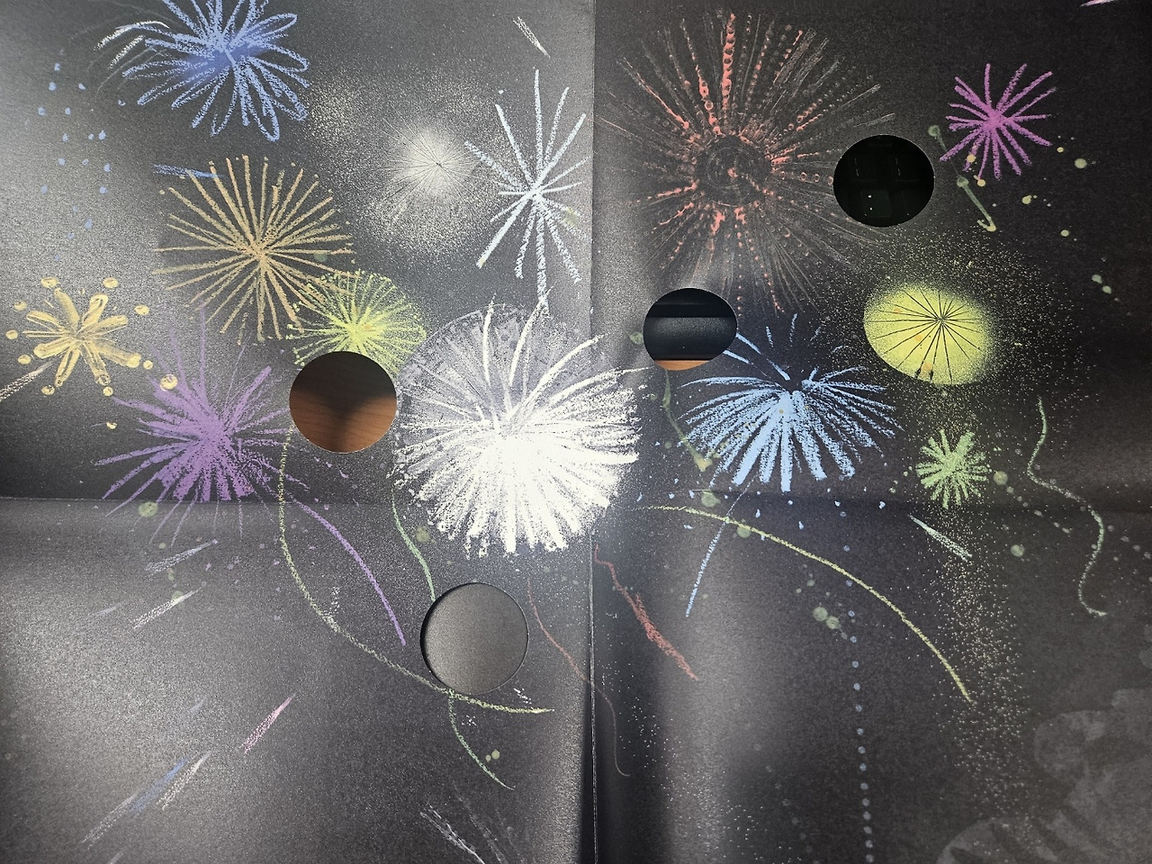 볼레로는 같은 멜로디가 계속 반복되고 쌓이다 무너지는 구조를 가지고 있는데 그를 어떻게 그림으로 표현할까 하다가 그 시기에 기사에서 본 뉴스의 전쟁사진에서 포탄이 공중에서 터지는 사진이 마치 불꽃놀이처럼 보인 것을 착안하여 여러 존재들과 춤을 추던 한 아이가 전쟁을 겪는 이야기가 써졌다고 하셨다. 폭탄으로 불꽃놀이를 어떻게 표현하시다가 책에 구멍을 뚫은 점 등의 작업 과정을 들으니 그림의 의미가 더 생생하고 깊이 와닿기도 했다.