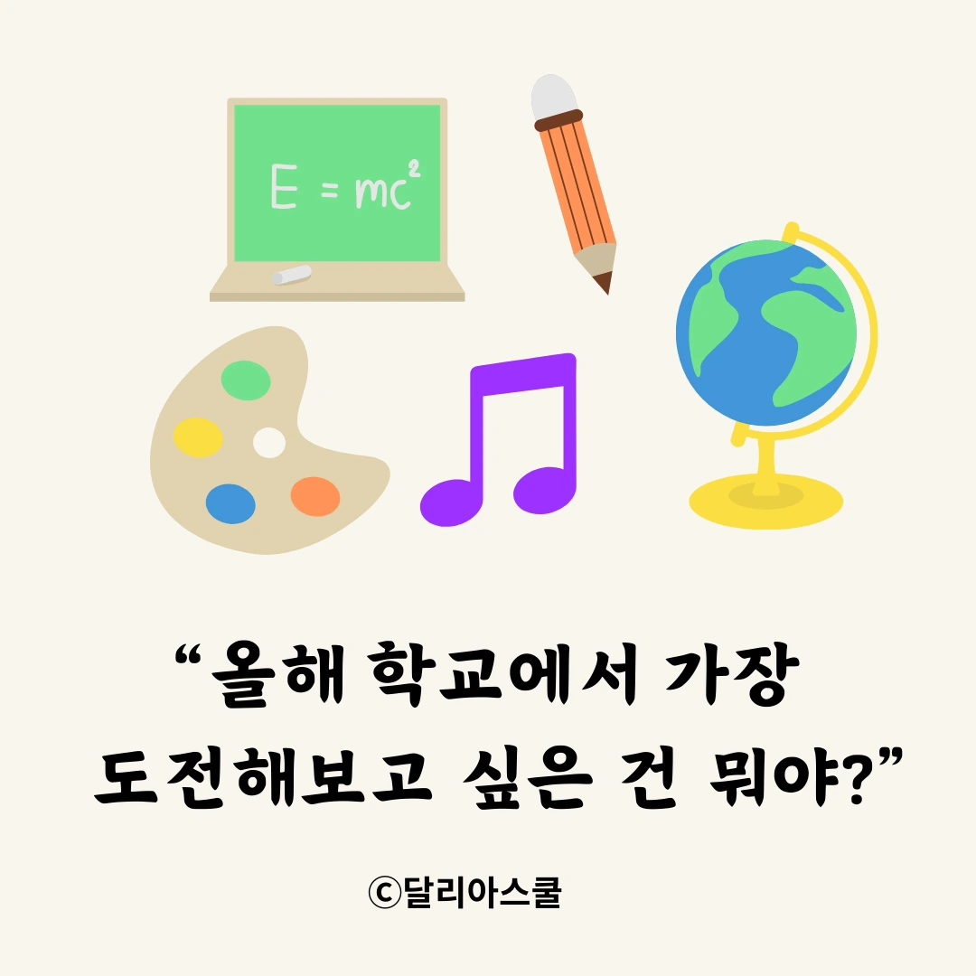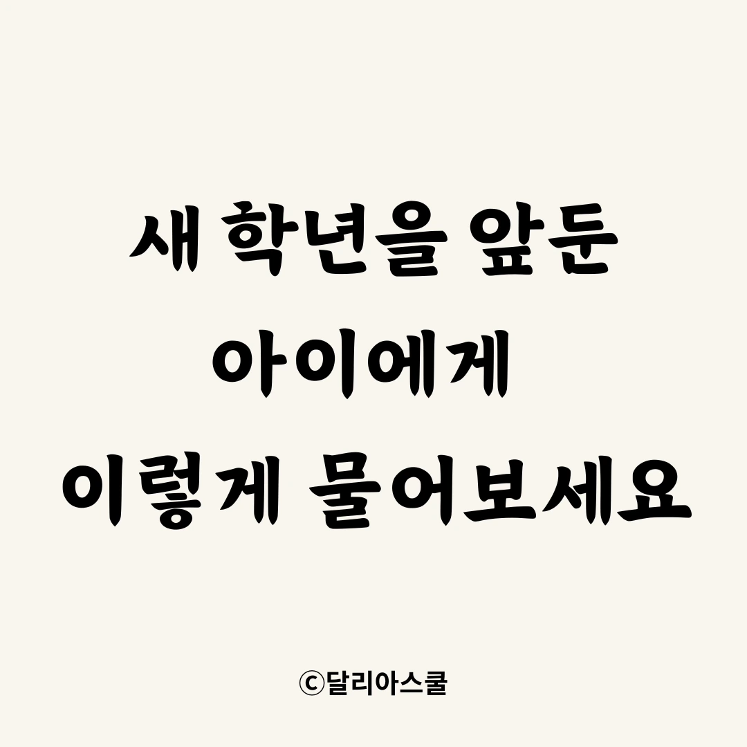새 학년을 앞둔 아이에게 이렇게 물어보세요. 긴장은 줄이고, 자신만의 성장 목표를 세우는데 도움이 될 거예요! 아이들과 함께 새로운 시작을 맞이하시는 부모님들과 선생님들을 힘껏 응원합니다.#달리아스쿨 #삶당사 #아이에게해주고픈말#아이에게 #새학년시작 #새학년 #입학 #아이공감 #아이마음 #아이공감