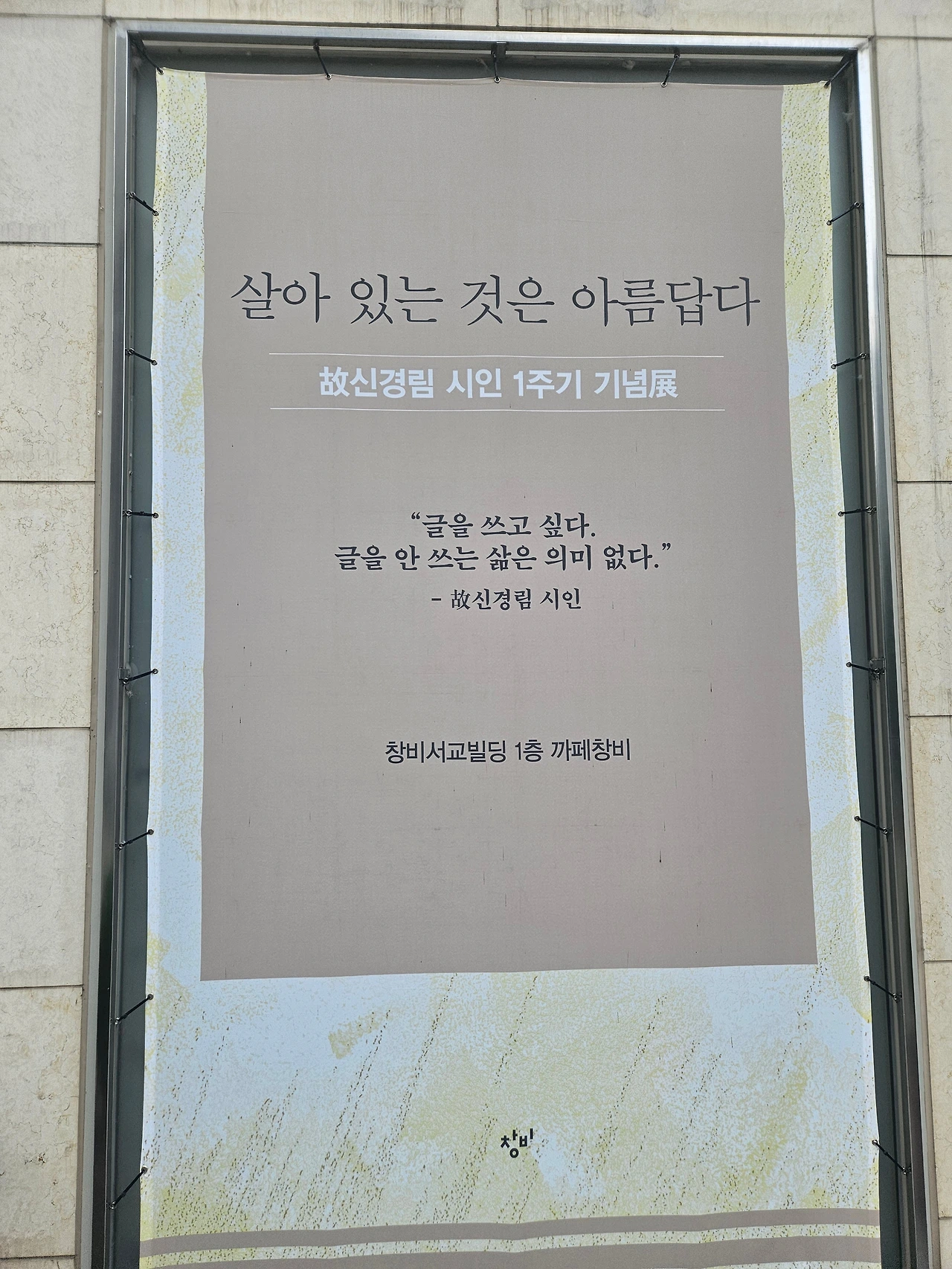 한강 작가님의 책들을 포함해 수많은 문학작품들을 출판해 온 창비출판사 건물에서 녹음을 하는 것도 많은 영감을 주네요. 오늘은 1층 카페에 들렀다가 신경림 시인님의 <살아있는 것은 아름답다> 전시를 보게 되었는데, 고인이 되신 시인님의 친필원고와 책들, 유품 등에 마음이 일렁거렸어요.