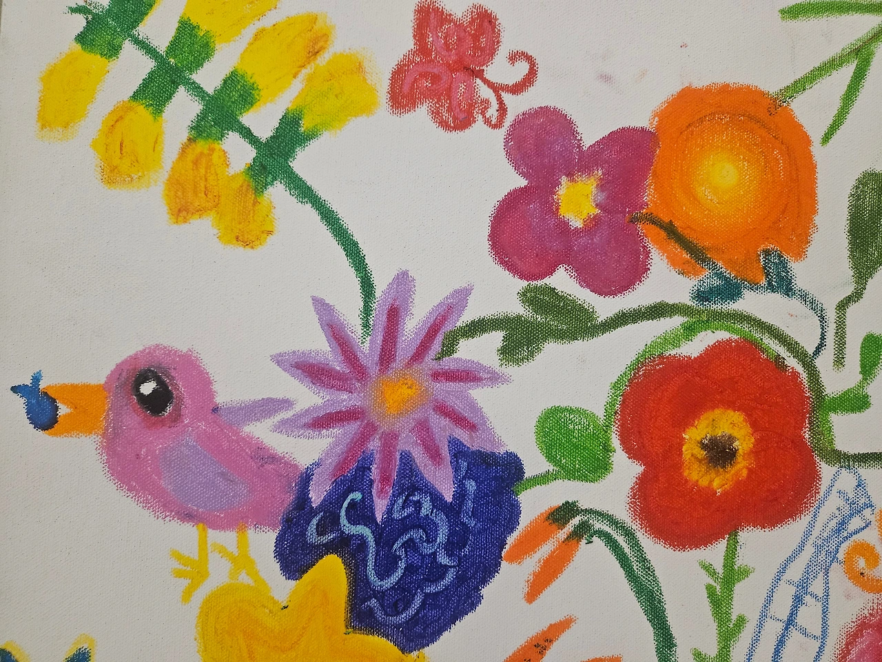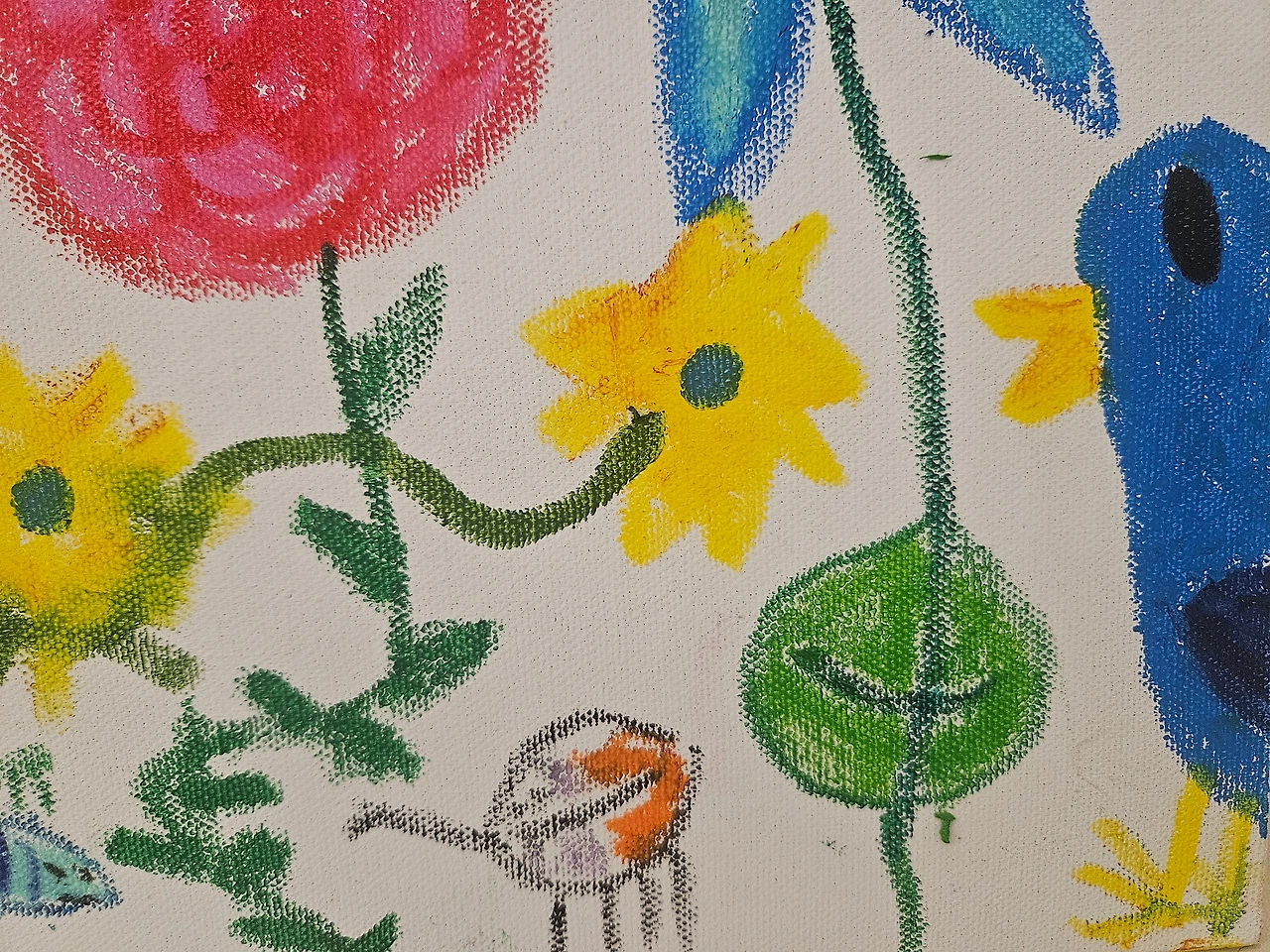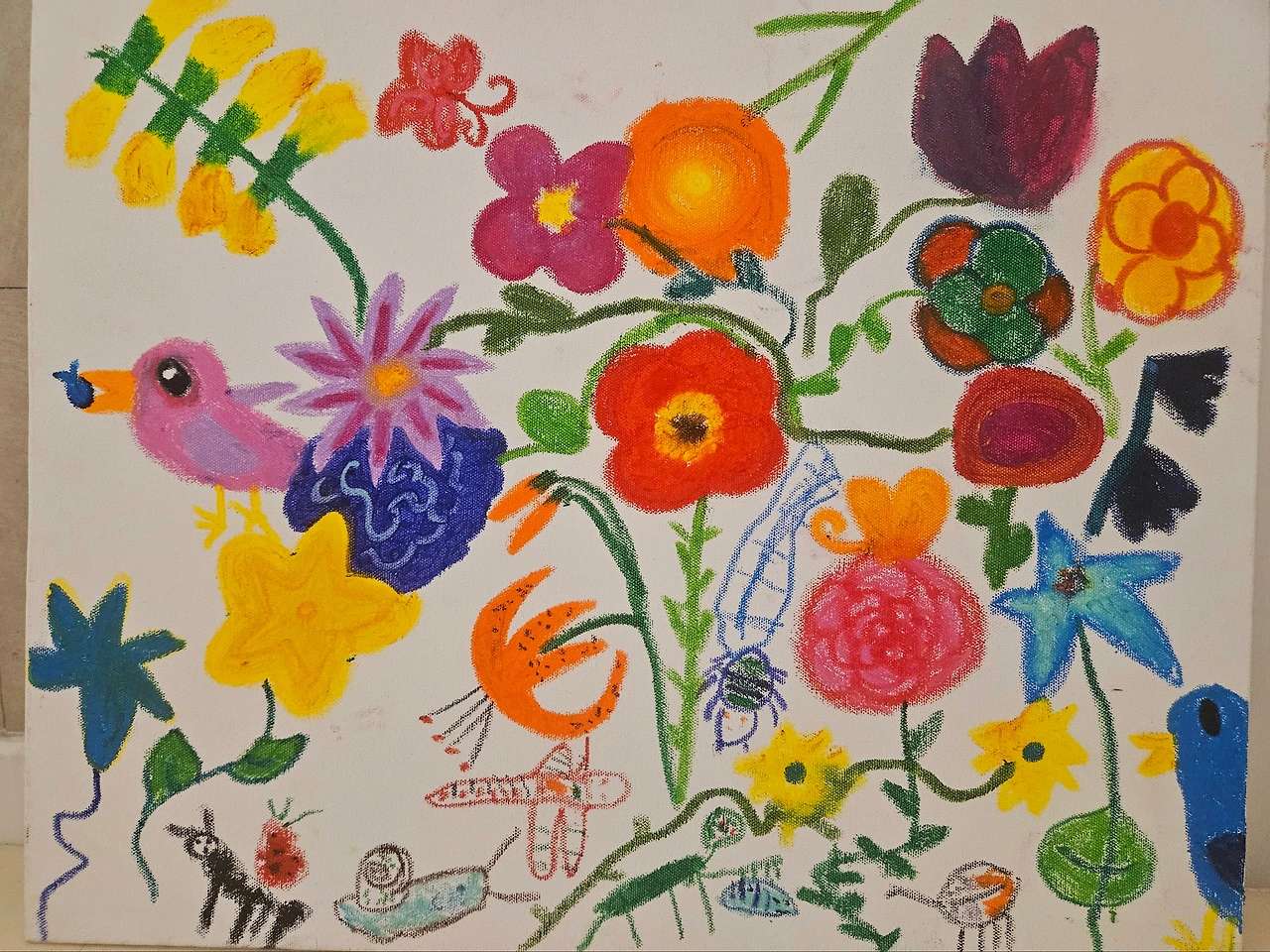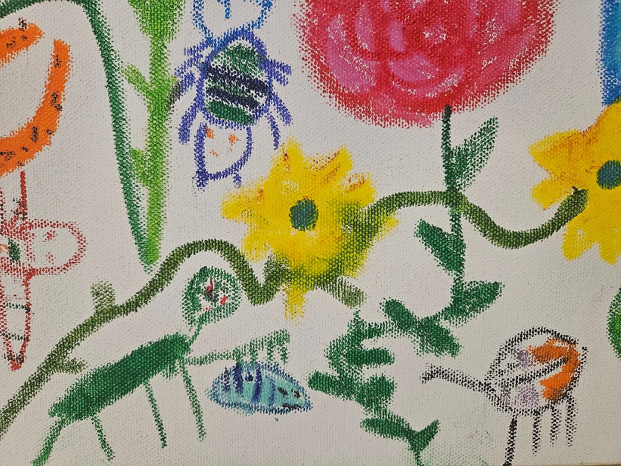 나는 평소 김종학 작가님의 그림을 좋아해서 꽃 그림을 보고 따라 그리기 시작했는데, 아이들이 다가와 각자가 그리고 싶은 것들을 그렸다. 곤충을 좋아하는 둘째는 개미, 거미, 사마귀, 잠자리 등의 곤충과 달팽이를, 꽃과 나비와 새를 좋아하는 첫째는 캔버스의 빈자리에 그림을 채워 넣었다.