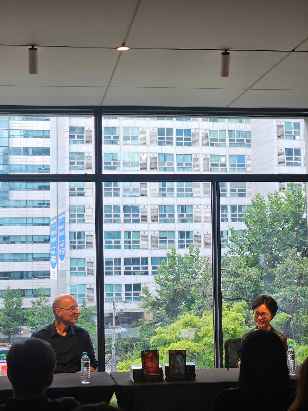 작가님께서도 기뻐해 주며, 고양이와 달리아 꽃과 태양 그림이 있는 특별한 사인을 해주셨다. 지난번에 인터뷰를 했던 북여사님께서 사회와 진행을 해주셨고, 아름다운 프랑스 대사관에서 진행된 행사라 더욱 의미 있고, 풍성한 시간이었다.