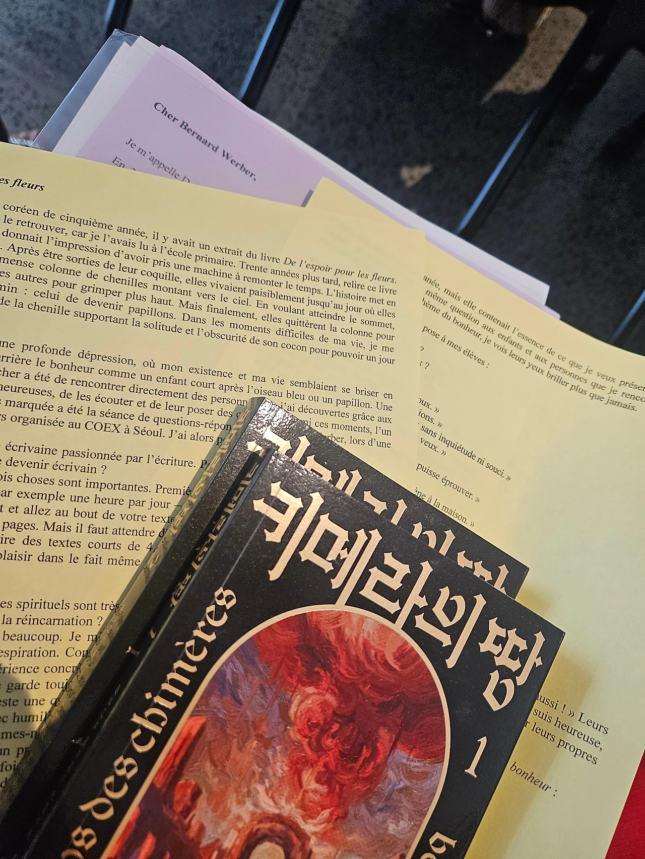 라는 나의 첫 번째 책에는 '꽃들에게 희망을'이라는 소제목으로 베르나르 베르베르 작가님과의 질의응답과 작가님의 답변이 실려있다. 그리고 그 대화에서 얻은 영감을 삶과 수업에 적용해오고 있는 내용이 더해졌다. 그 챕터와 감사편지를 불어로 번역을 맡겨서 작은 선물들과 함께 전해드렸다.