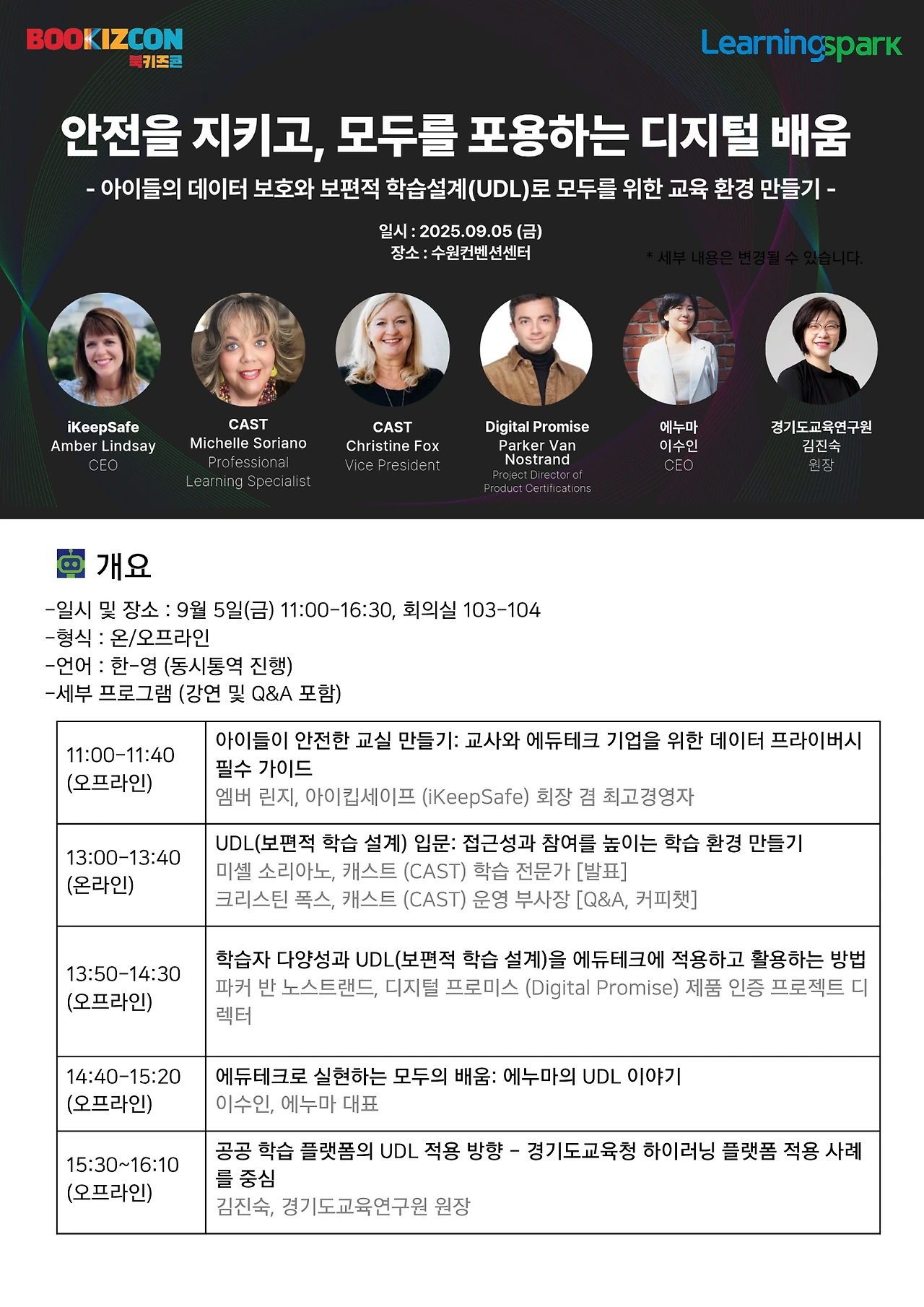 지금 우리가 살고 있는 때가 “전 세계 모든 세대가 다시 배워야 하는 시대”라는 말씀에 정신이 번쩍 깨는 듯한 느낌이 들었고, 어디서든 교육이 접근 가능한 시대임에도 ‘여전히 학교는 함께 살아가는 곳을 배우는 곳’이라는 말씀에 미래 학교의 역할에 대해 보다 구체적으로 생각해 보게 되었다. 또한 최근 많은 논란이 되고 있는 디지털 교과서에 대해서도 UDL 학습을 위한 도구로 쓰일 때의 장점과 보완점 등에 대해 현장의 교사나 교육 관계자, 개발자 등의 구성원들이 먼저 충분히 논의하고 이해하는 시간이 필요하겠다는 생각이 들었다.