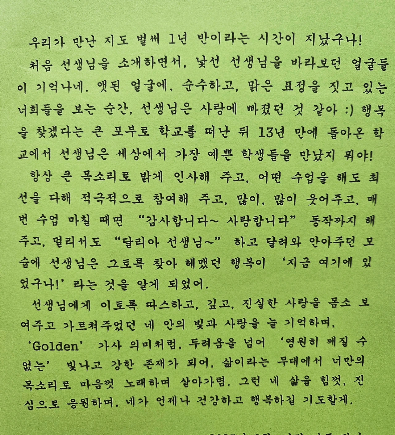 편지를 나눠주며, 한 명, 한 명 눈을 맞추고, 두 팔을 벌려 꼭 안아주었다. 때론 엄마처럼 곁에 두고 잔소리도 하며 더 챙겨주고 싶은 아이들도 있어 차마 마음이 떠나지 않았다. 편지를 받아 들고서 수줍게 웃거나, 울음을 터트리며 안기던 아이들의 모습에 나도 웃고 또 울었다. 평생 간직한다며, 꼭 꿈을 이뤄 다시 만나자고 감사 편지를 써온 아이들도 있었다.