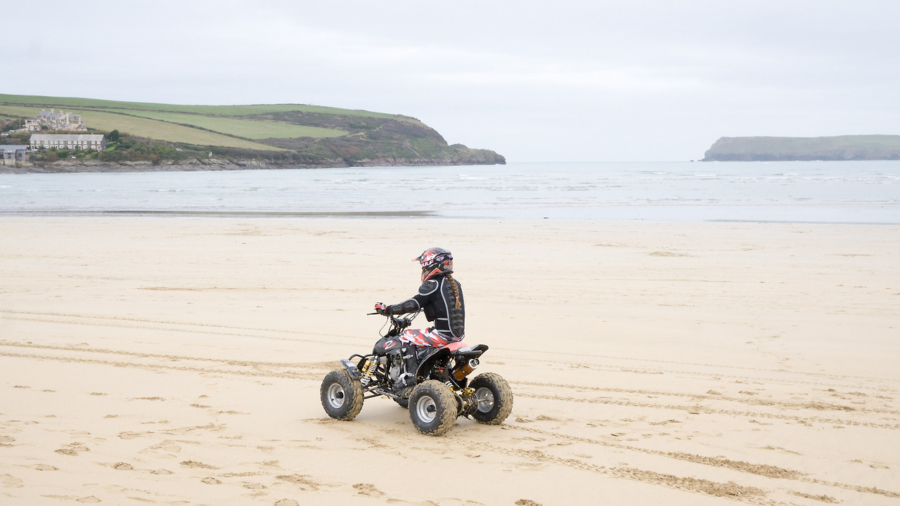 바닷물이 빠진 넓은 백사장에서는 어린이들이 4륜 오토바이를 타고 있다.