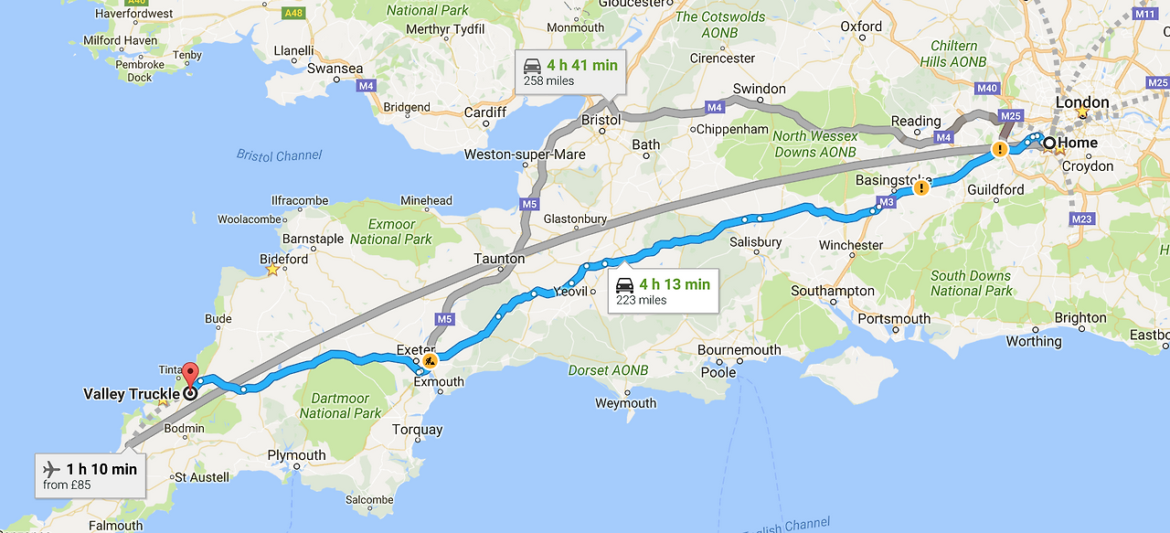 런던에서 출발하여 콘월로 가는 길은 크게 2갈래로 나뉘어진다. 조금 돌아가지만 고속도로를 따라 달리는 코스(M4 – M5)와 가로지르는 국도를 따라 가는 코스 (M3 – A303).