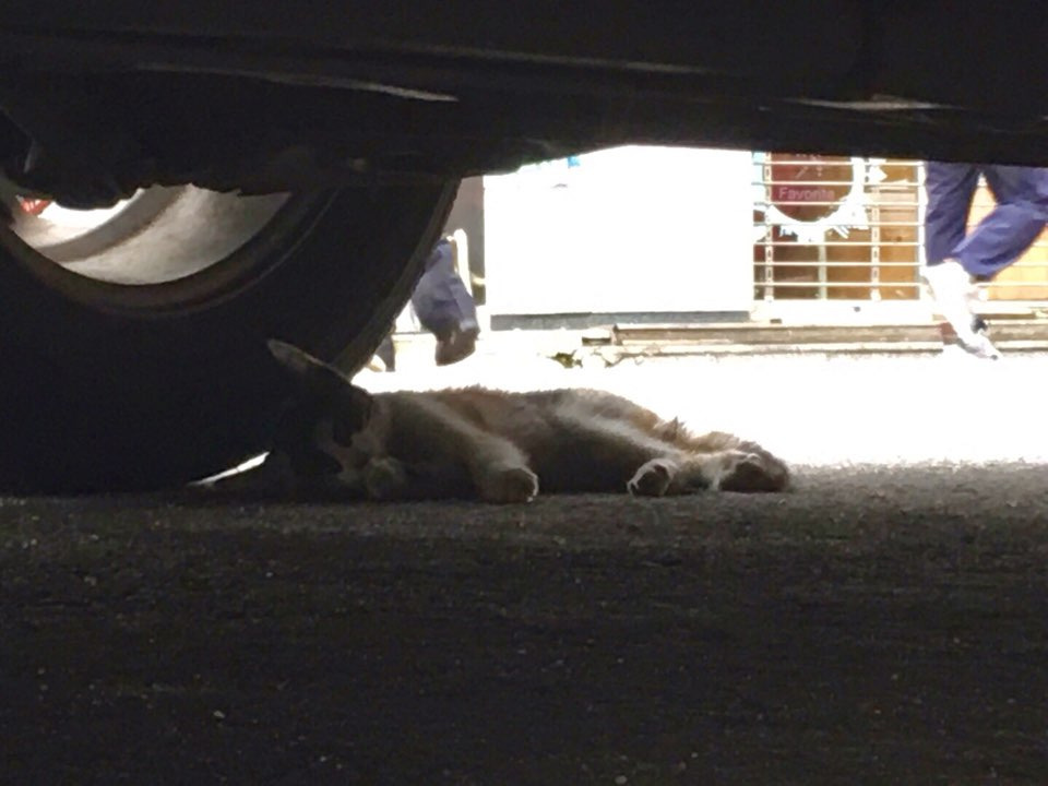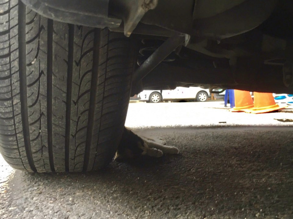 "뒷바퀴에 새끼 고양이가 있으니 조심해 주세요!!"