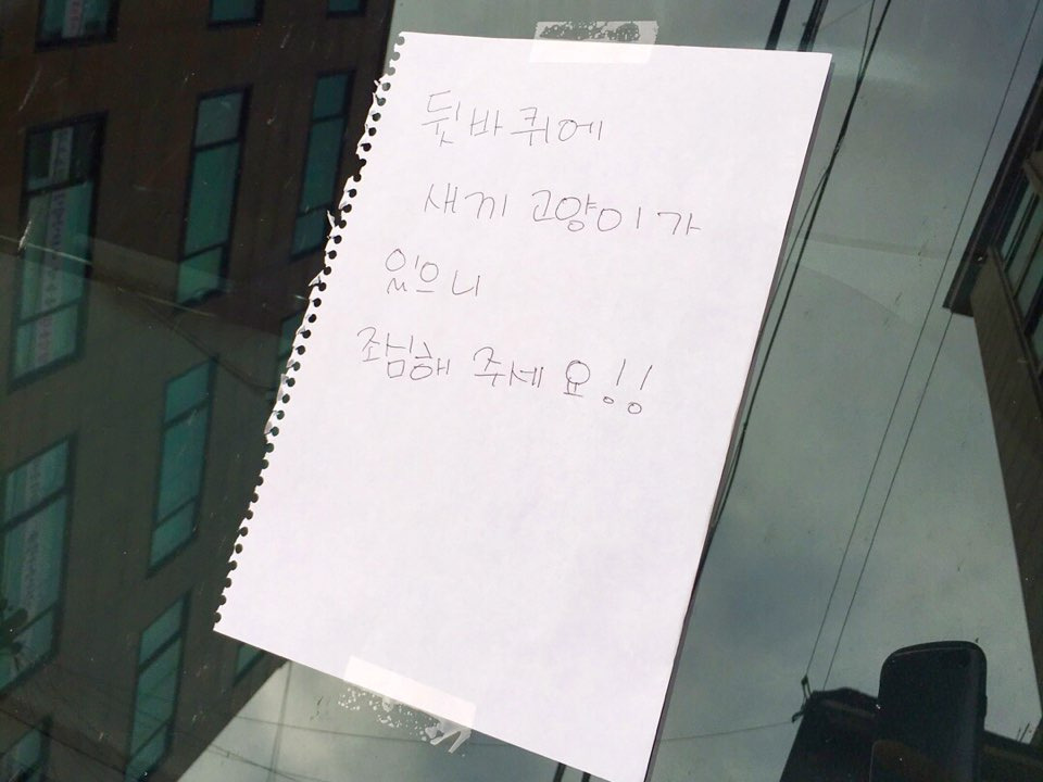 나는 모두가 귀여워서 웃음이 났다. 한낮 더위를 피해 자동차 아래 잠든 새끼 고양이도, 급히 스프링 노트를 찢어 '조심해 주세요!!' 글을 써 붙인 아르바이트생도, 아이스크림 봉다리를 들고 무심한 얼굴로 찰칵찰칵 사진을 찍은 남편도. 종이를 발견하고 조심조심 자동차를 옮길 차주인도 분명 귀여울 것이다. 모두가 귀여웠다.