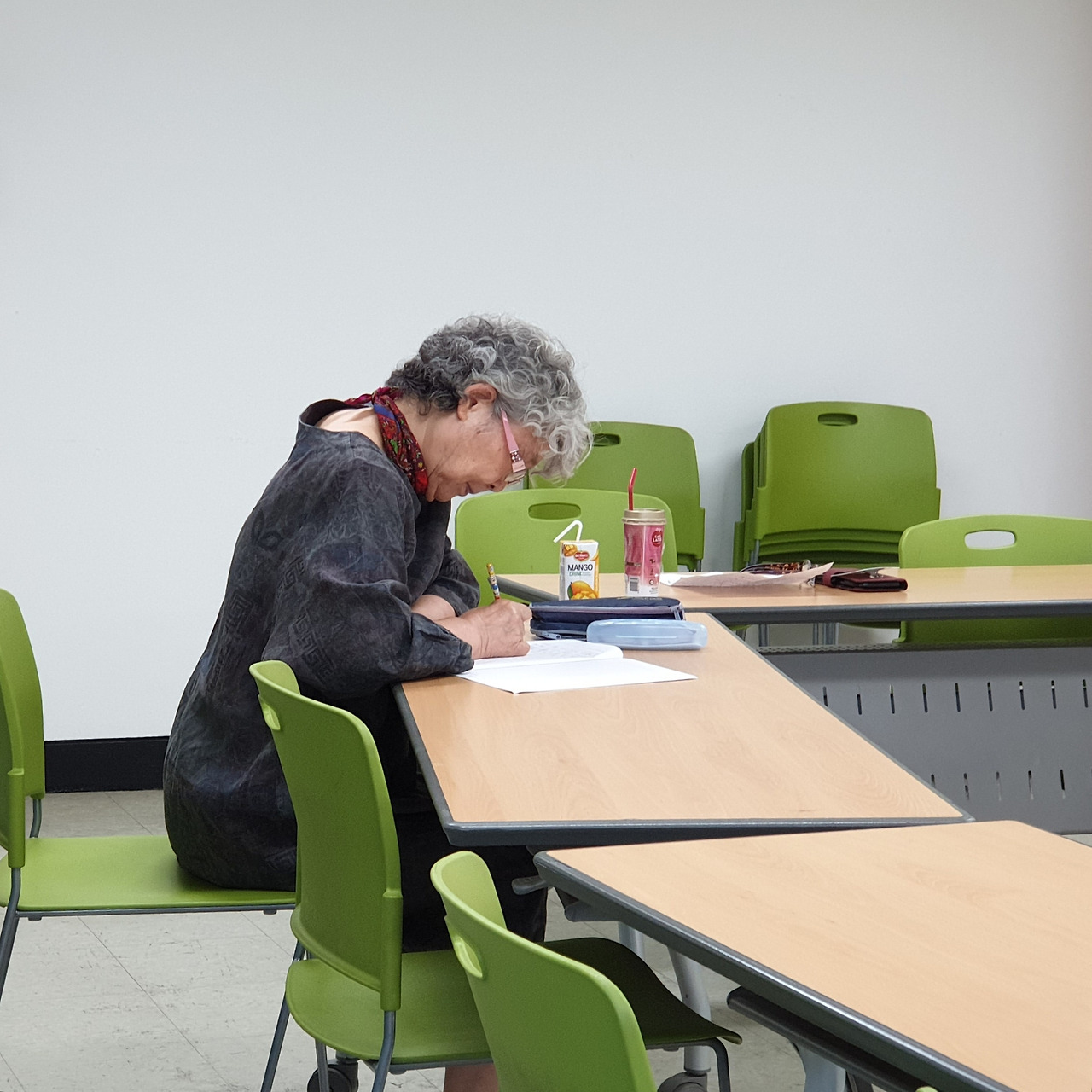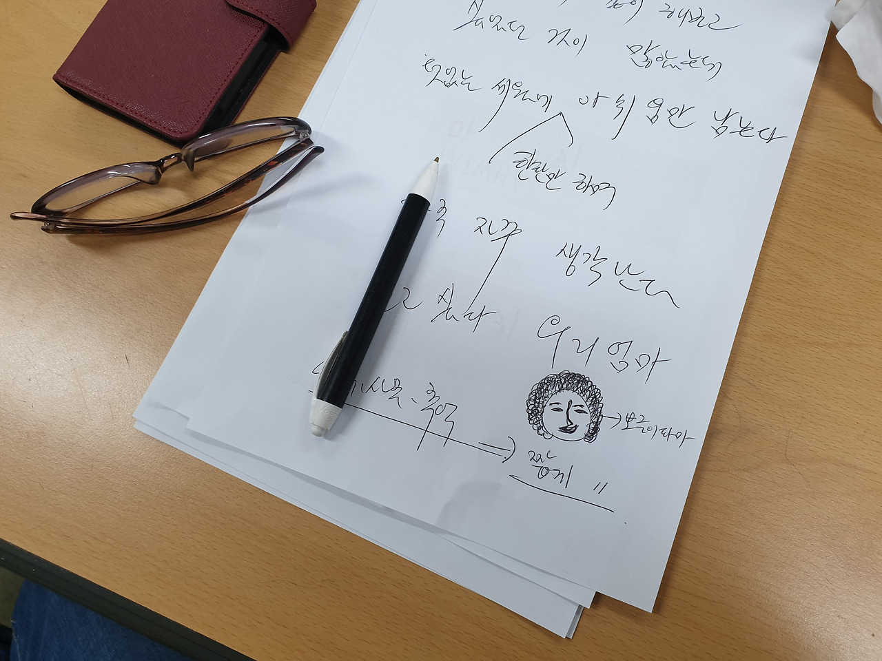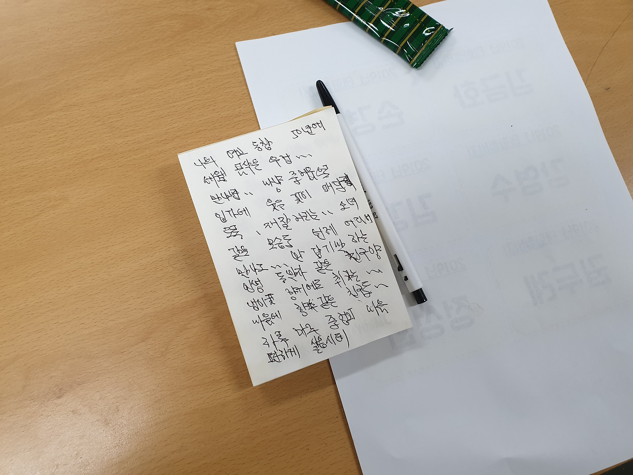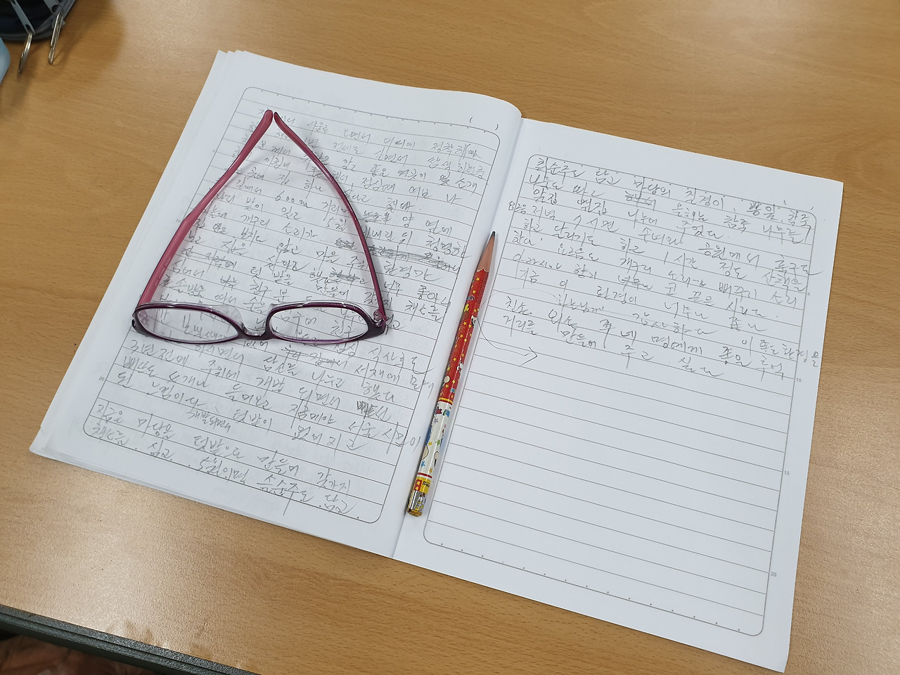 <인생 스케치북 프로젝트> 어제의 풍경. 가장 먼저 도착한 교실에서 홀로 글 쓰는 할머니. 고요한 그 모습이 아름다워서 한참 바라보았다. 쉬는 시간에 공책을 봐도 되겠냐며 할머니 옆자리에 앉았다. 공책에는 똑같은 글들이 여러 장 적혀 있었는데, 자기 글씨가 부끄러워서 몇 번이나 똑같은 글을 깜지처럼 공책에 적으셨던 것이었다. 꾹꾹 눌러쓰고 줄 긋고 덧쓰고 다시 쓰고. 큼지막한 글자들이 힘주어 적혀 있었다. '이것만으로도 충분해요.' 말씀드렸는데 할머니가 내 눈을 빤히 바라보며 말씀하셨다.