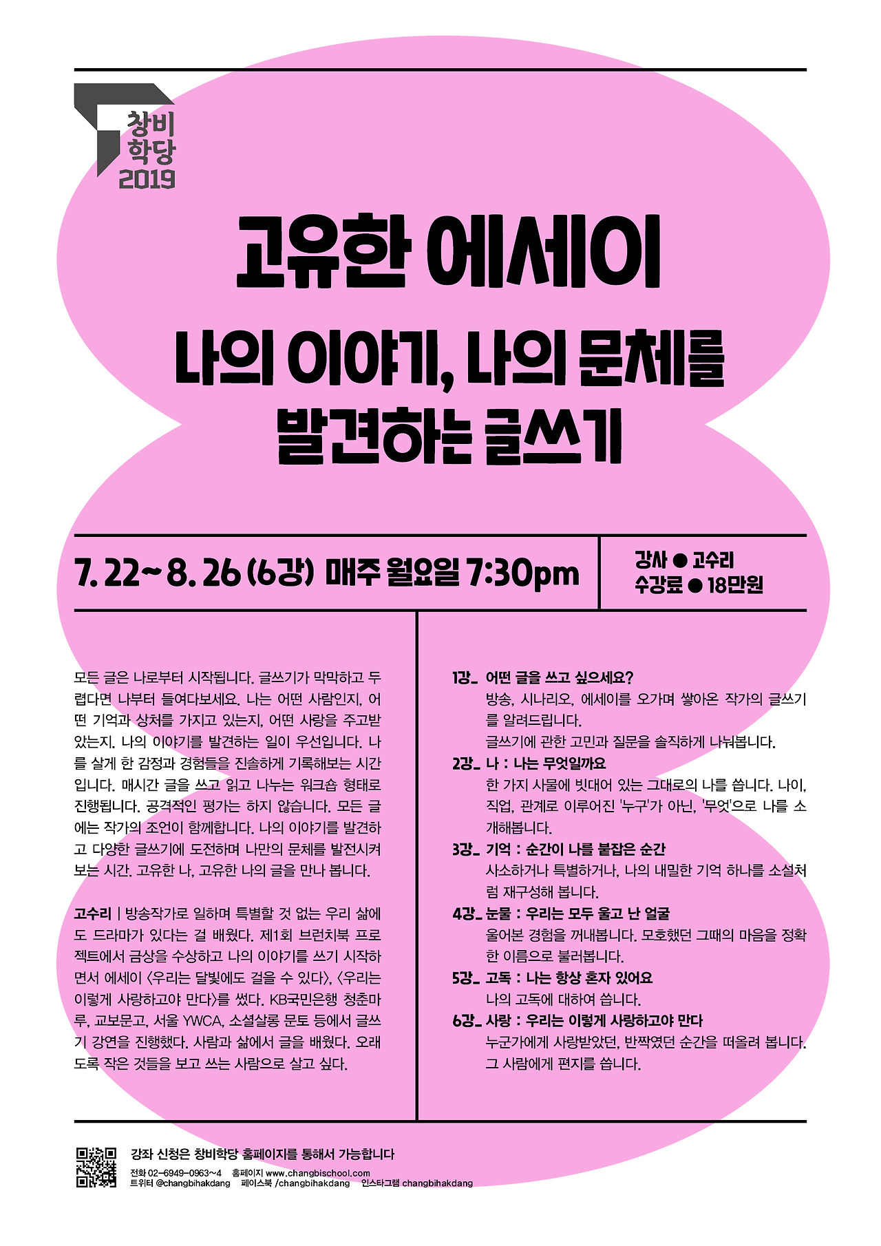 7월 22일부터 창비학당에서 <고유한 에세이> 강좌를 진행합니다. 단순히 글쓰기 기술을 알려주는 강좌는 아니에요. 12명 정원의 소수정예 글쓰기 워크숍으로 진행됩니다. 6주 동안 월요일 밤마다 만나 글 쓰고 읽고 나누는 시간을 가질 텐데요. 내밀한 쓰기와 나누기를 통해 각자가 간직하고 있는 고유한 이야기와 문체를 발견하도록 도와주는 모임입니다. 나만의 고유한 글을 쓰고 싶은 분들을 기다립니다. 강좌는 아래와 같이 진행됩니다.