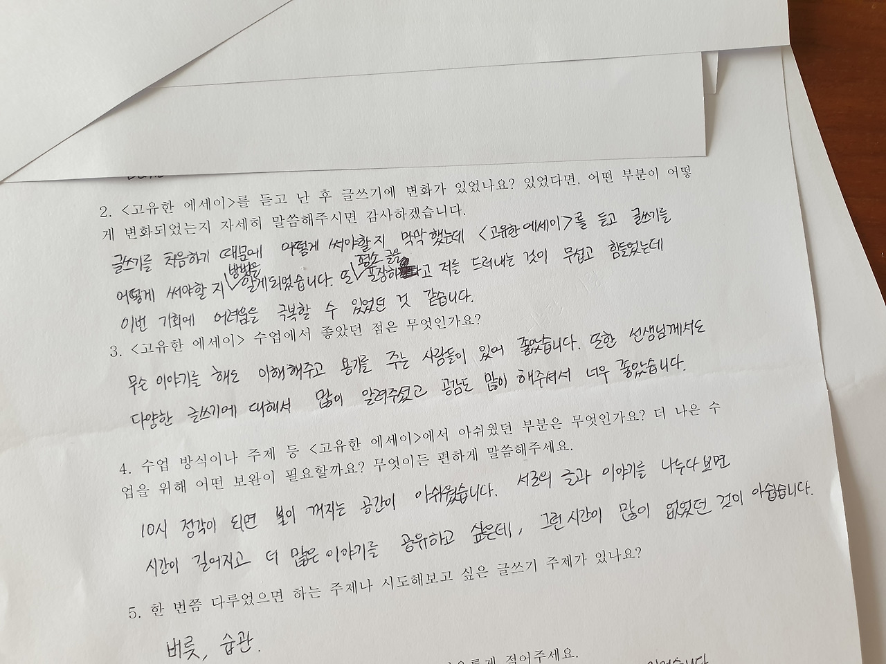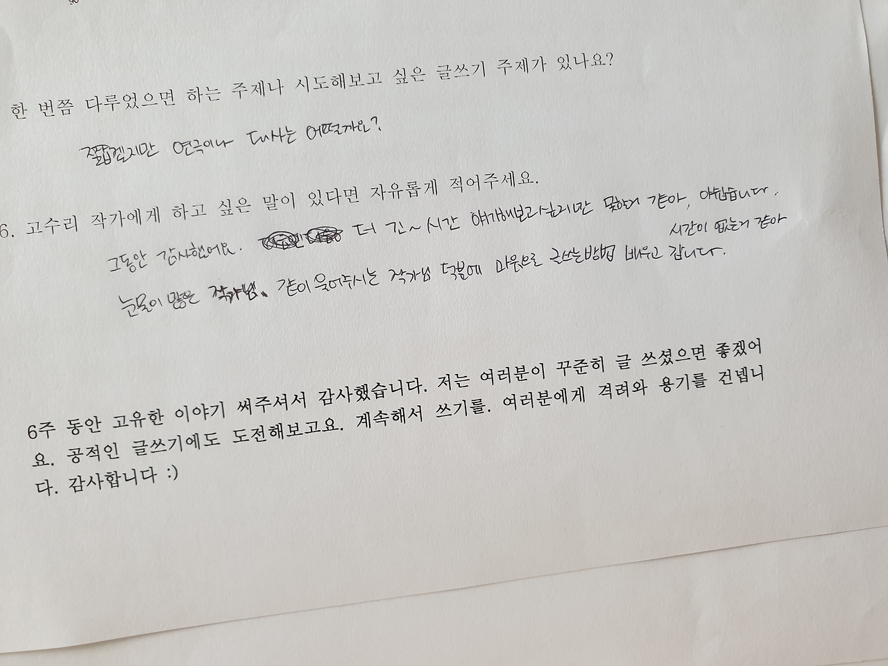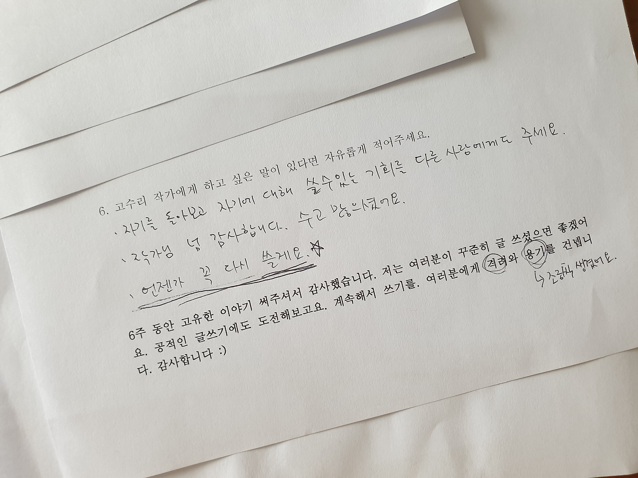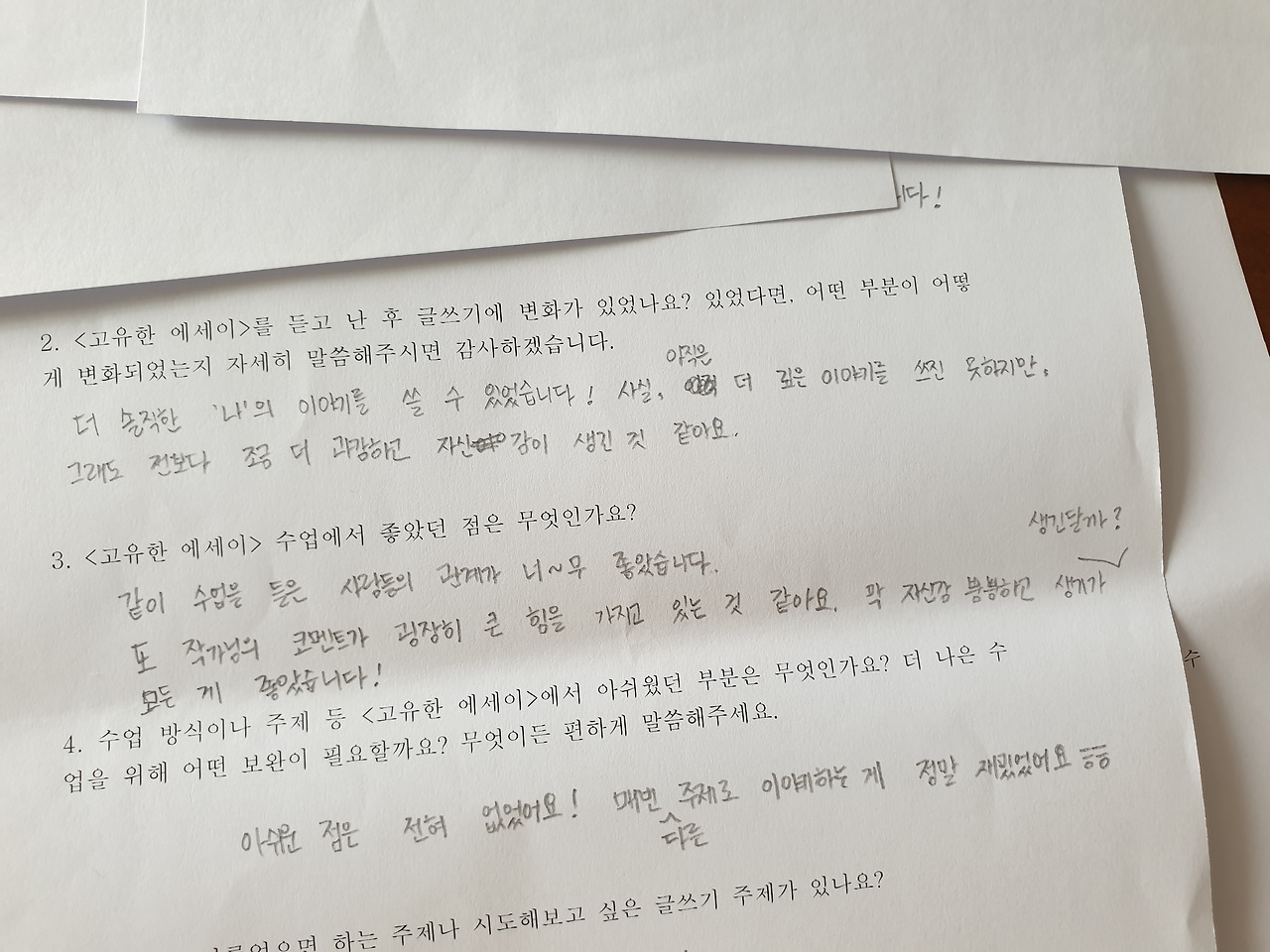 - 수업이 끝나고 다음 주제가 주어지면 내내 생각하고 글을 썼어요. 쉬울 때도 어려울 때도 있었지만, 그냥 글쓰기가 너무 즐거워요.