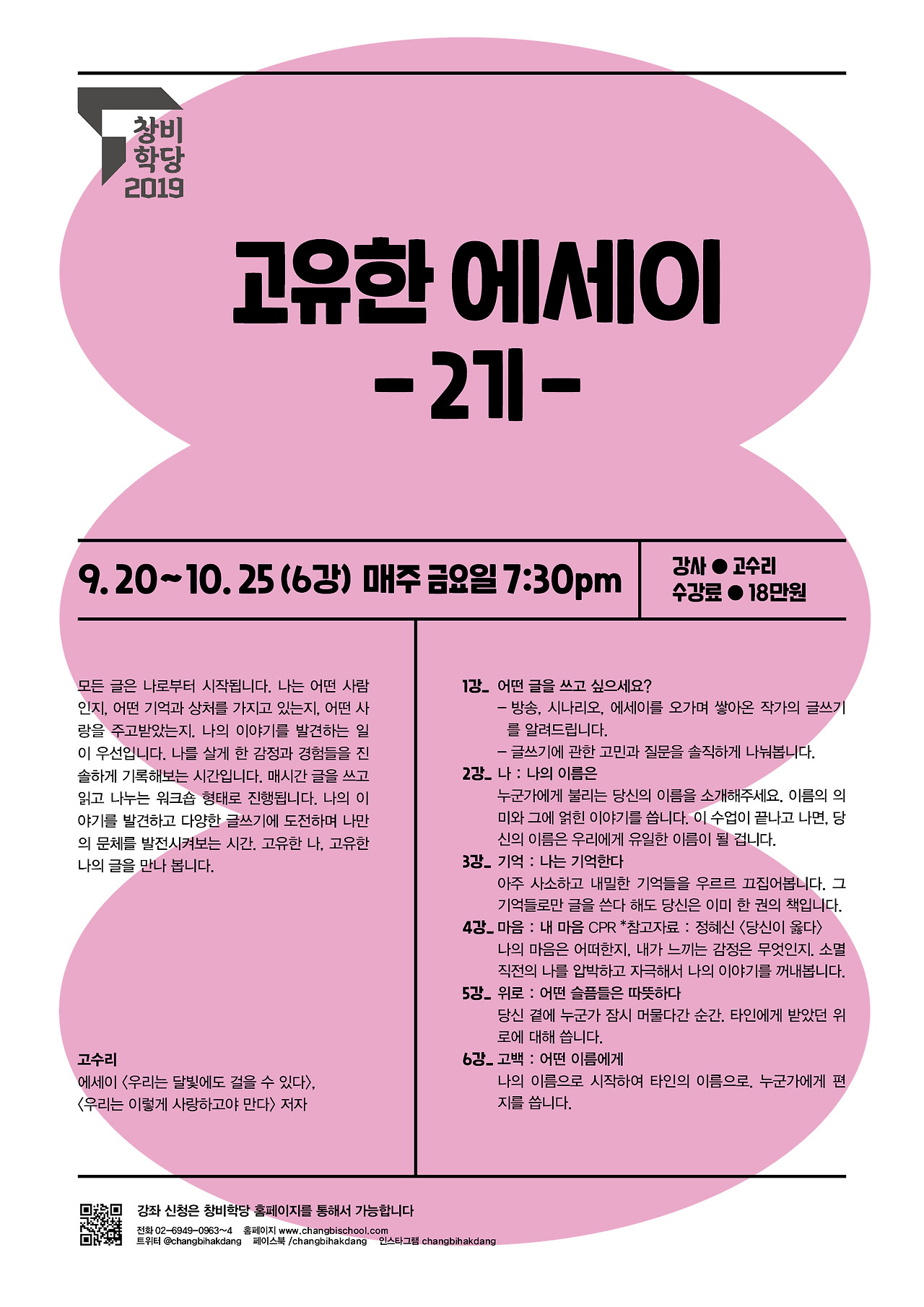 9월 20일부터 창비학당에서 <고유한 에세이> 2기 강좌를 진행합니다.단순히 글쓰기 기술을 알려주는 강좌는 아니에요. 12명 정원의 소수정예 글쓰기 워크숍으로 진행됩니다. 6주 동안 금요일 밤마다 만나 글 쓰고 읽고 나누는 시간을 가질 텐데요. 내밀한 쓰기와 나누기를 통해 각자가 간직하고 있는 고유한 이야기와 문체를 발견하도록 도와주는 모임입니다. 나만의 고유한 글을 쓰고 싶은 분들을 기다립니다. 강좌는 아래와 같이 진행됩니다.