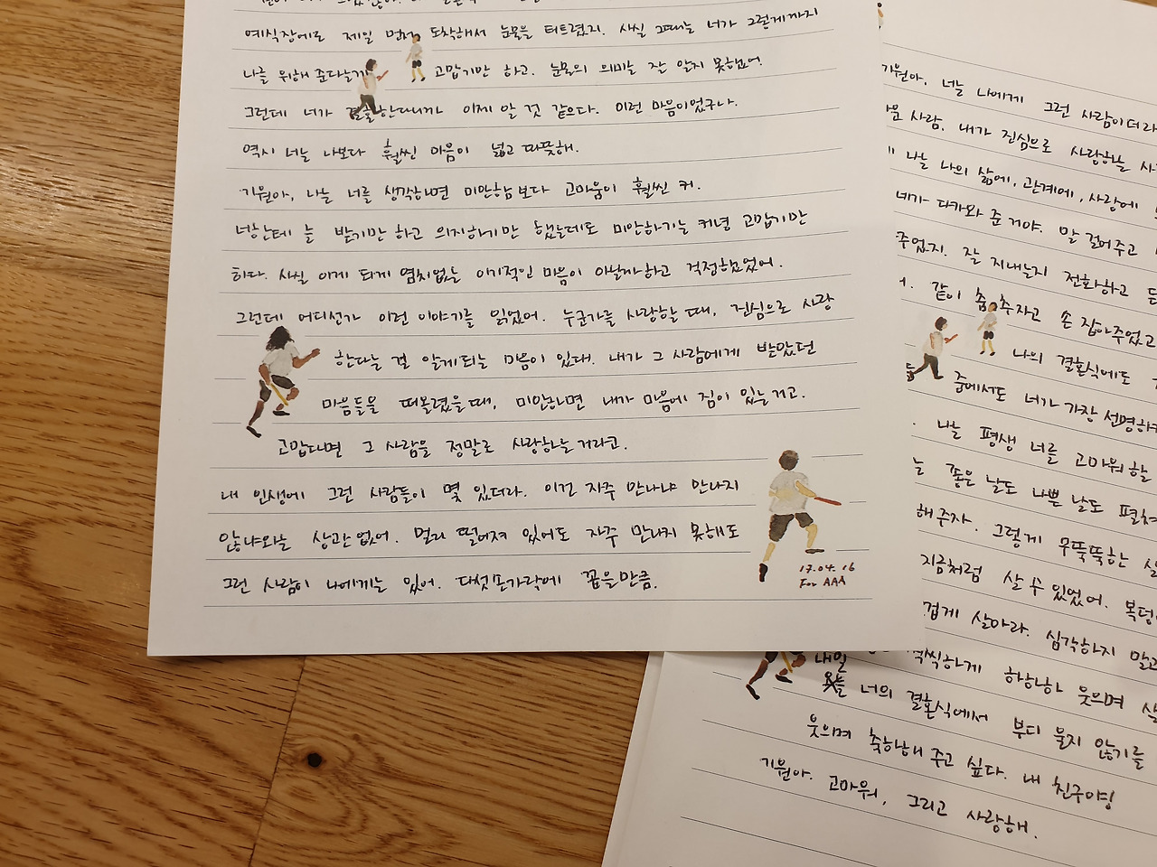 나는 좋아하는 사람을 만날 때마다 손편지를 적어주는 괜찮은 취미가 있다. 나의 편지는 여러 장의 긴 편지일 때도 있고, 손바닥만 한 작은 엽서일 때도 있다. 직접 고른 책의 속지일 때도 많다. 누군가에게 선물을 줄 때도 반드시 편지와 함께 준다. 달랑 선물만 주고 나면 어쩐지 내 마음을 제대로 전하지 못한 것 같은 아쉬움이 들어 아주 짧더라도, 축하해. 고마워. 건강해. 힘내. 사랑해. 내 마음을 손글씨로 적어 건넨다.