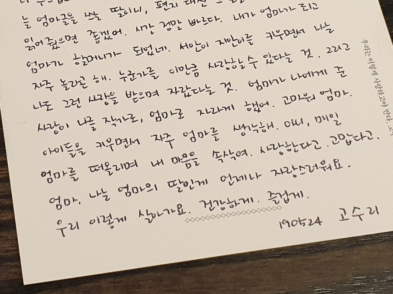 “엄마, 나는 아이들을 키우면서 놀라곤 해. 누군가를 이만큼 사랑할 수 있다는 것, 그리고 나도 그런 사랑을 받으며 자랐다는 것이 너무 신기해서. 엄마가 나에게 준 사랑이 나를 작가로, 엄마로 자라게 했어. 고마워 엄마. 사랑해.”