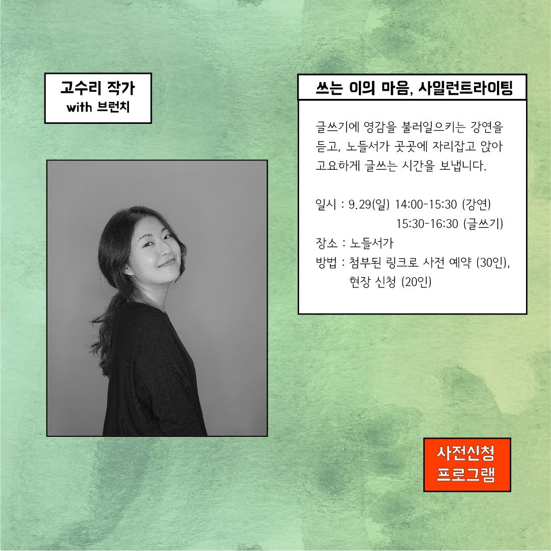 [프로그램 사전예약] 쓰는 이의 마음, 사일런트 라이팅 노들서가는 책을 읽고, 쓰고, 만드는 모든 마음을 담은 '책문화 생산자의 플랫폼'입니다. 계절마다 순환하는 큐레이션, 책문화 생산자들의 고유한 가치와 철학을 담은 스토리텔링형 매대. 고요히 글을 쓰고 읽는 공간 등 책과 연결된 모든 마음이 깃든 '책의 집'입니다.