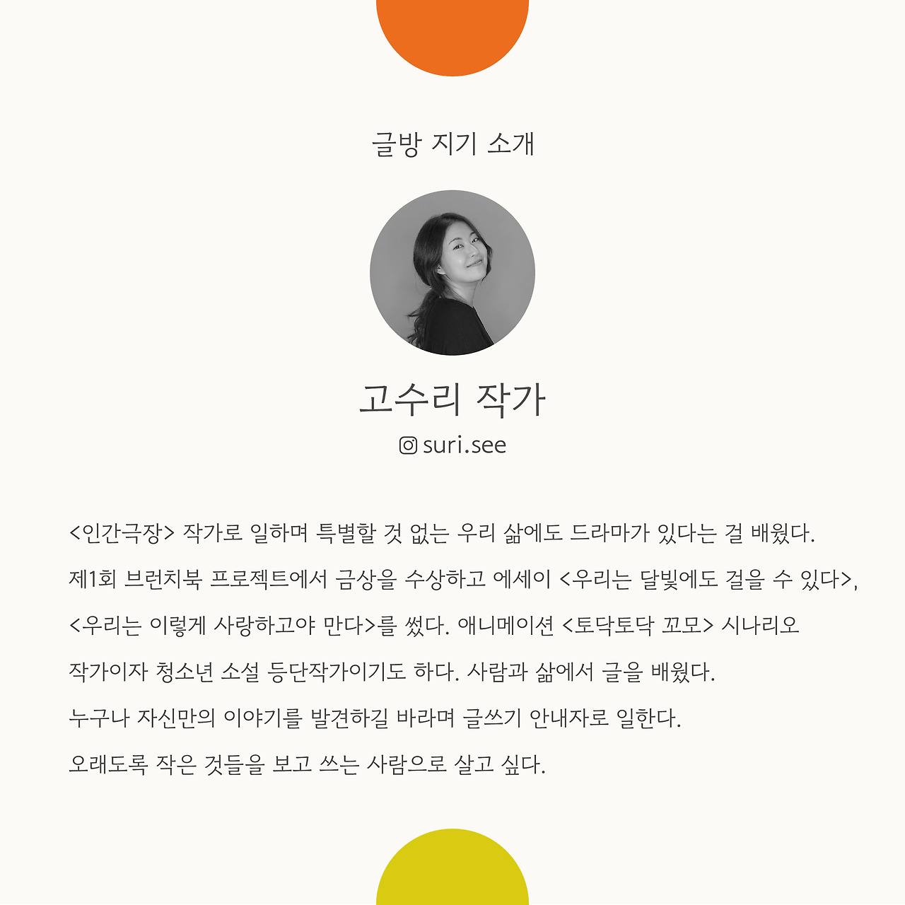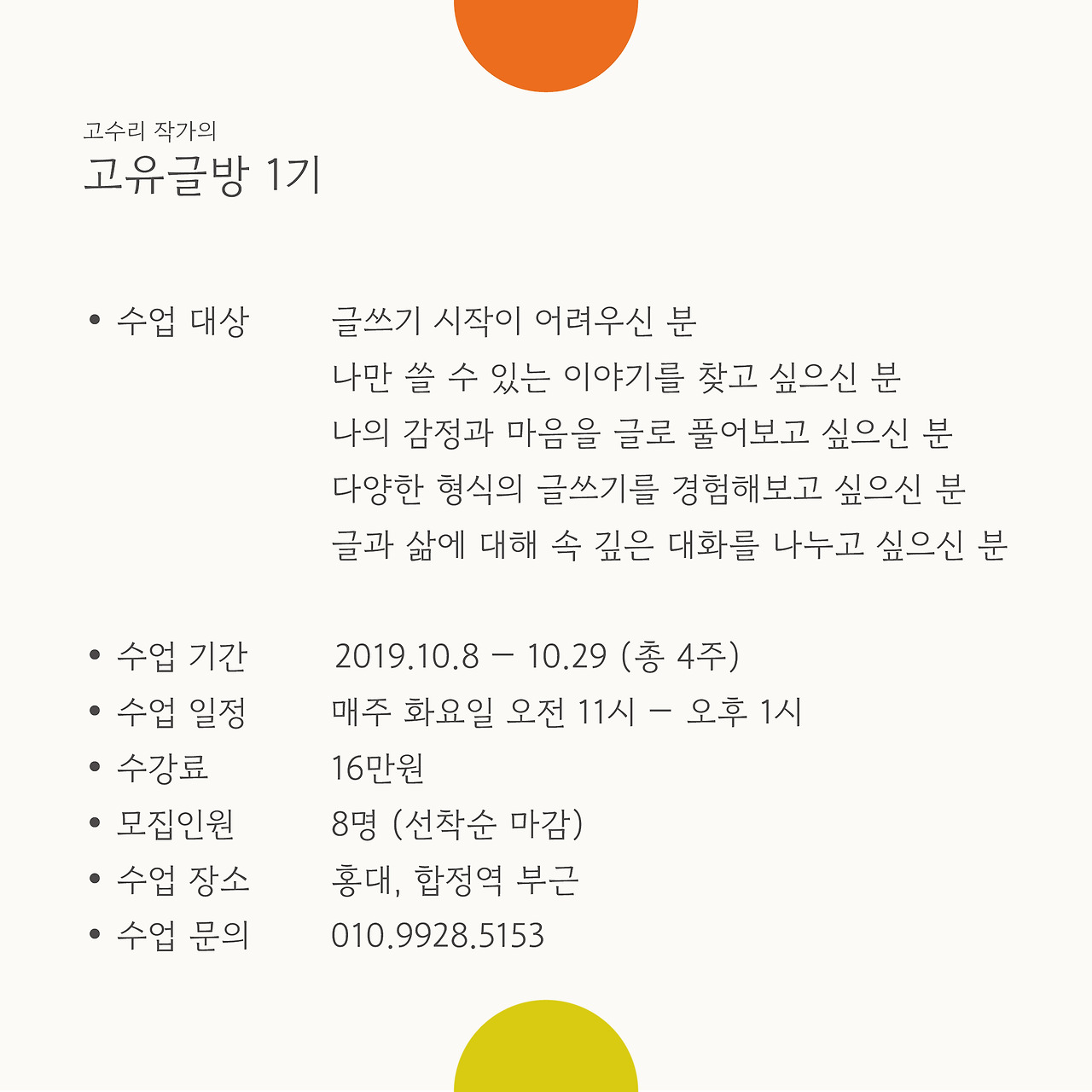 처음 글 쓰시는 분들도 대환영입니다. 쓰지 않던 사람이 쓰는 사람이 되는 모습을 지켜볼 때가 가장 뿌듯하거든요. <고유글방>에서 고유한 나, 고유한 나의 이야기를 발견하셨으면 좋겠습니다.
