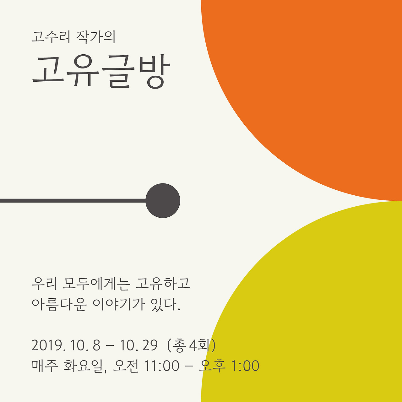 <고유글방>은 평범한 사람들의 고유한 이야기를 발견하고 쓰고 담아보자는 마음으로 만든 글방입니다. 평생교육 & 예술교육의 일환으로 4년째 <책 만들기 프로젝트>를 함께 진행해온 고수리 작가와 '그대와스튜디오' 왕덕 기획자가 힘을 합쳤는데요.