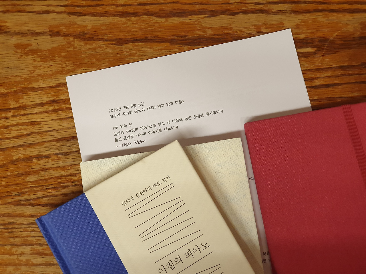 취향관 <책과 펜과 밤과 마음> 첫 번째 밤, '책과 펜'의 시간. 김진영 <아침의 피아노>를 읽고 나눴다.