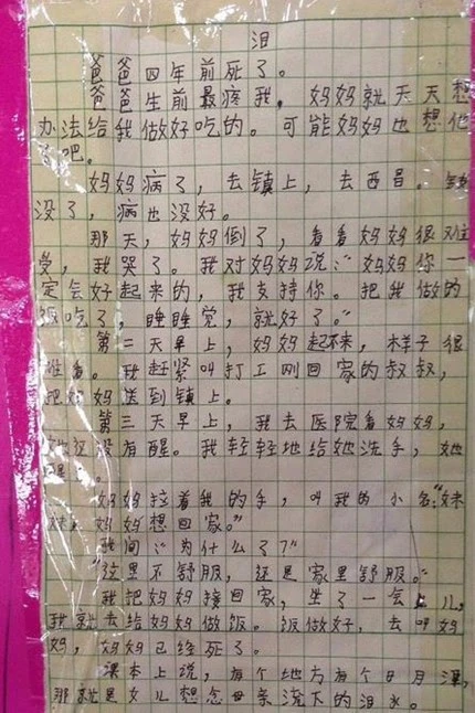 무쿠이우무는 엄마가 돌아가신 이야기를 300여 글자의 짧은 글로 썼다. 이 글은 교실 벽에 걸려있다가 자원봉사를 하던 교사가 인터넷에 올리면서 알려졌다. 인터넷에 퍼진 이 글은 ‘세상에서 가장 슬픈 수필’로 회자되면서 중국인의 마음을 울리고 있다.