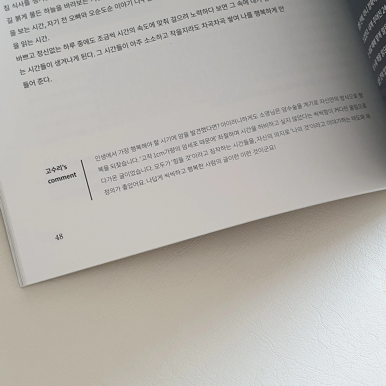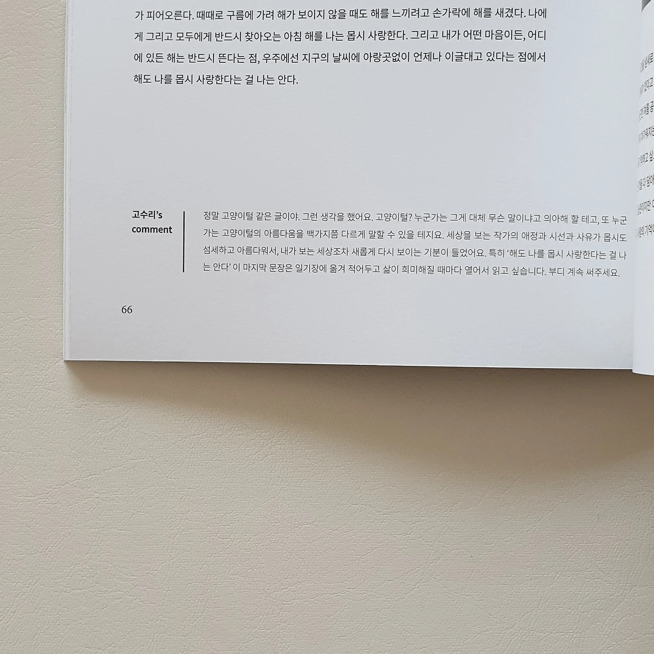 러시아 모스크바에서 보내온 글도 있었다. 우연히 그곳에 정착하게 된 글쓴이는 재작년 모스크바 12월 일조량이 6분이었다는 이야기를 듣는다. 한 달 동안 겨우 6분만 해가 난 것이다. 궂은 하늘과 눈 덮인 땅이 전부인 모스크바의 겨울에 갇혀 지내던 어느 날, 갑자기 해가 났다. 슈퍼마켓 반짝 세일 같은 햇볕이 쏟아졌다. 그러자 남녀노소 모든 사람들이 하던 일을 멈추고 밖으로 나왔다. 모두가 볕을 쬐며 산책하는 풍경이 눈앞에 펼쳐졌다. 이후로 글쓴이는 산책하는 시간을 가장 좋아하게 되었다고 얘기했다.