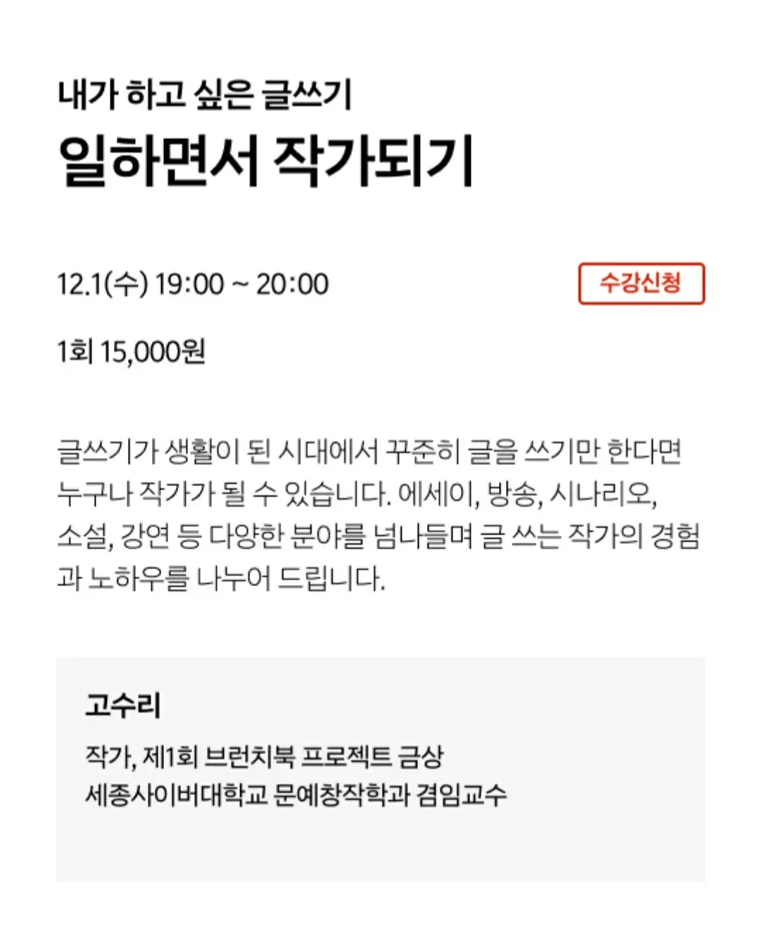글쓰기가 생활이 된 시대에서 꾸준히 글을 쓰기만 한다면 누구나 작가가 될 수 있습니다. 에세이, 방송, 시나리오, 소설, 강연 등 다양한 분야를 넘나들며 글 쓰는 작가의 경험과 노하우를 나누어 드립니다.