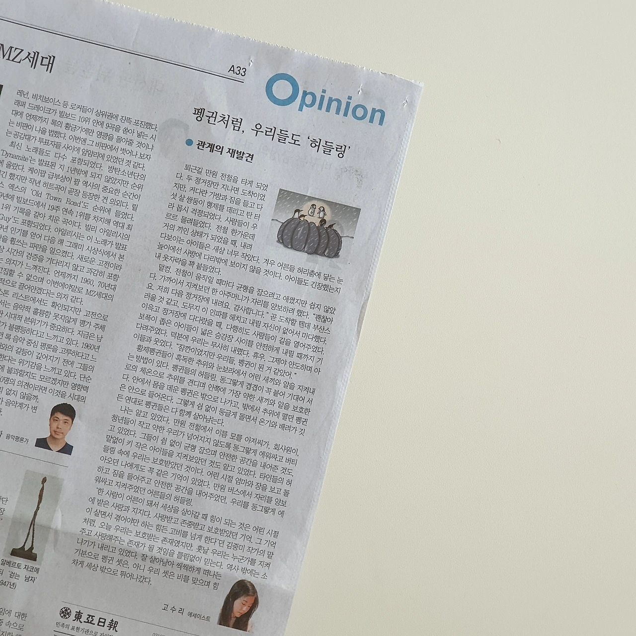 덜컹. 전철이 움직일 때마다 균형을 잡으려고 애썼지만 쉽지 않았다. 가까이서 지켜보던 한 아주머니가 자리를 양보하려 했다. “괜찮아요. 저희 다음 정거장에 내려요. 감사합니다.” 곧 도착할 텐데 부산스러울 것 같고, 도무지 이 인파를 헤치고 내릴 자신이 없어서 마다했다. 이윽고 정거장에 다다랐을 때, 다행히도 사람들이 길을 열어주었다. 보폭이 좁은 아이들이 넓은 승강장 사이를 안전하게 내릴 때까지 기다려주었다. 덕분에 우리는 무사히 내렸다. 휴우. 그제야 안도하며 아이들과 웃었다. “잠깐이었지만 우리들, 펭귄이 된 거 같았어.”
