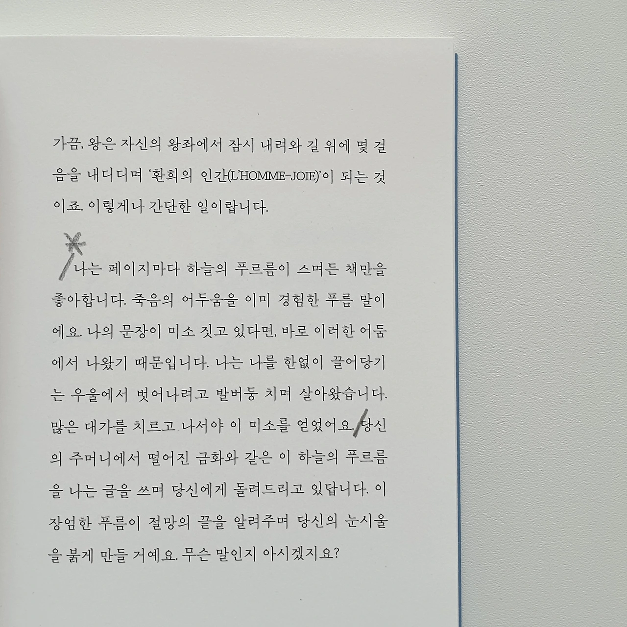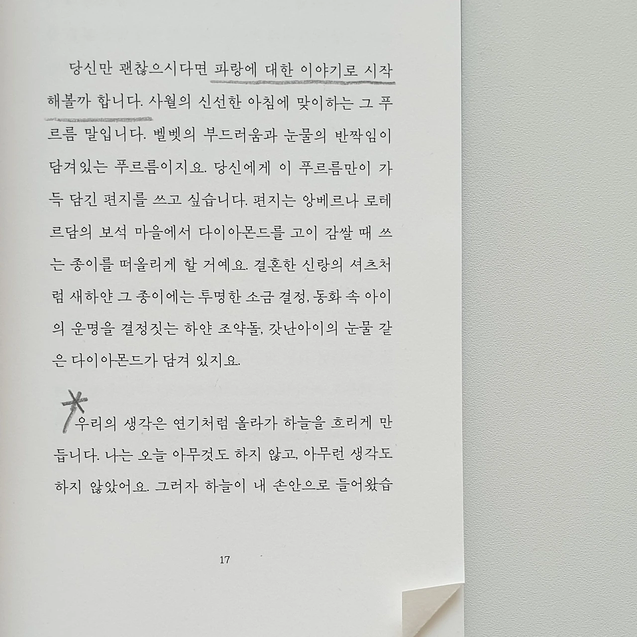 하루를 소망한다. 아주 잠시 동안이라도 파랑을 발견하는 하루가 되고 싶다. 궂은 날 후에 찾아온 하늘의 푸르름을 진정 알아채는 마음으로 하루를 살고 싶다. 밤에는 아름다웠던 오늘의 순간을 돌아보며 미소짓고 싶다.