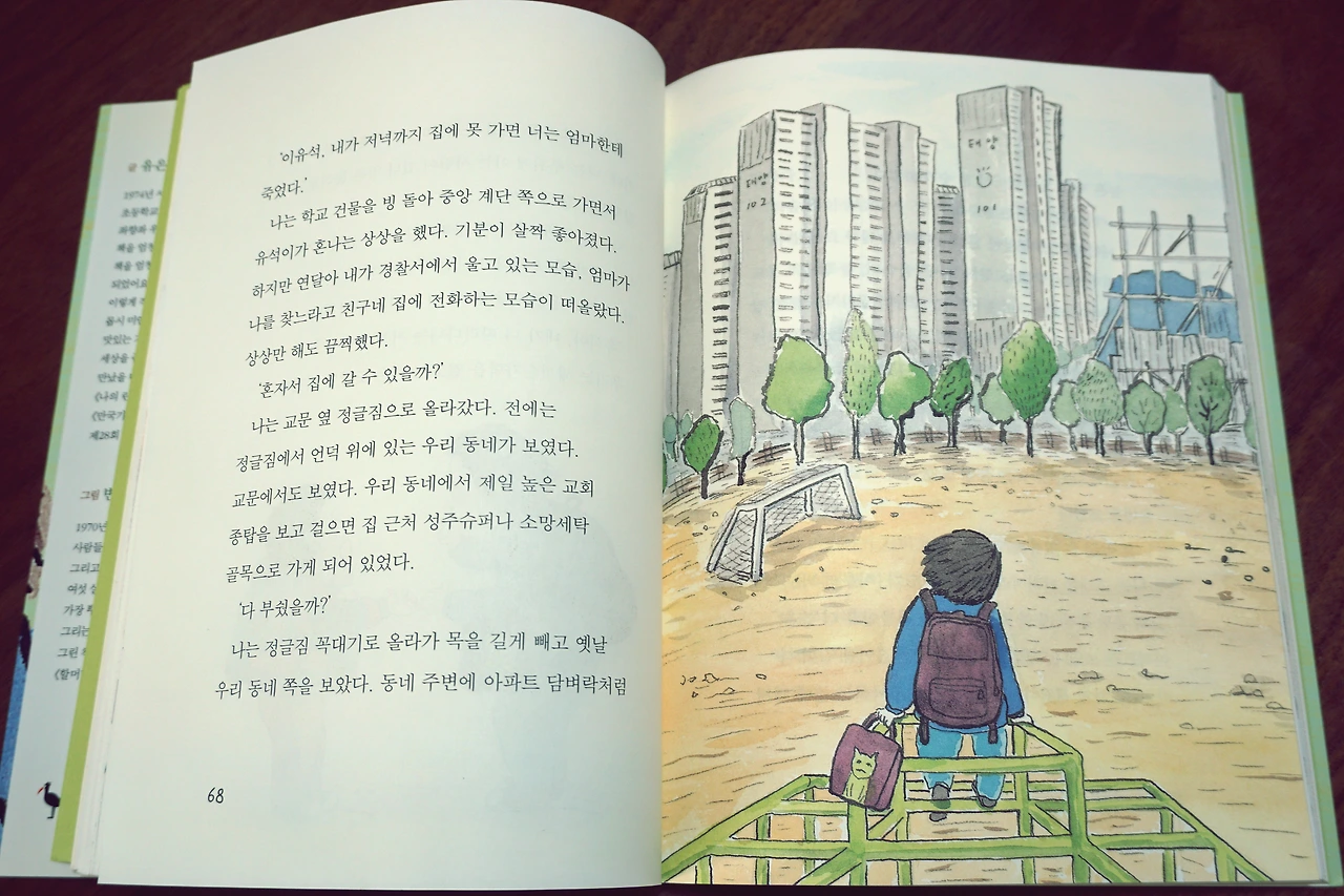 나는 정글짐 꼭대기로 올라가 목을 길게 빼고 옛날 우리 동네 쪽을 보았다. 동네 주변에 아파트 담벼락처럼 높은 막이 쳐져 있어서 볼 수가 없었다.