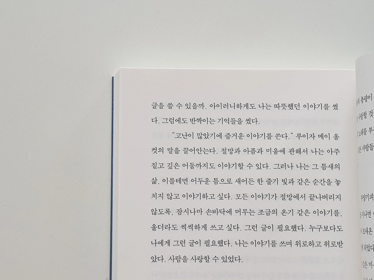 참 좋았던 질문이었고, 답변하려는데 '용기'라는 단어가 선명히 떠올랐다. 에세이 쓰기는 명백히 어렵다. 한 사람이 살아온 한 사람의 진짜 이야기니까. 쓰고 싶어 하는 많은 이가 쓰기 직전의 문턱에서 주저한다는 사실을 안다. 남들은 보이지 않는 아주 두꺼운 유리벽을 앞에 둔 사람처럼, 나아갈 수 없는 것이다.