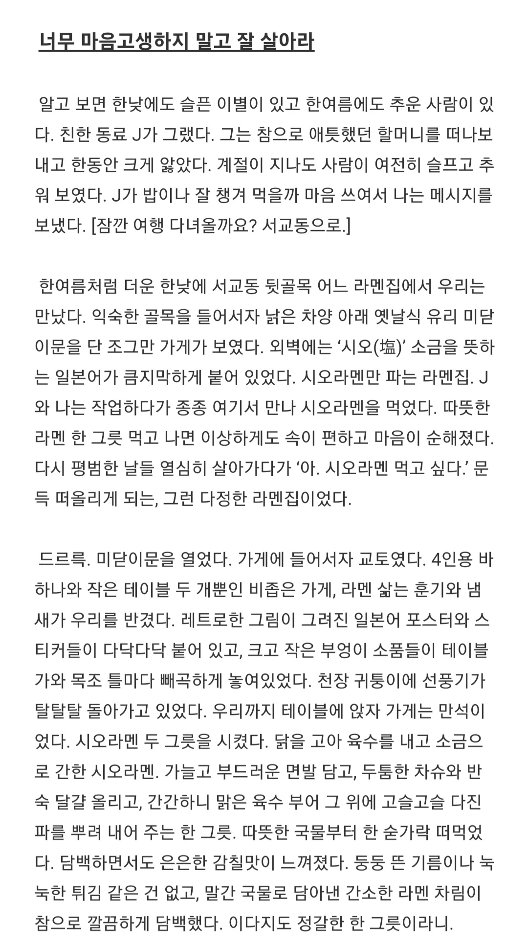 “그럼요. 그럴 거예요. 가마있어보그라. 준아, 너무 마음고생 말고 자알 살그래이.” J의 경상도 사투리가 너무나 찰져서 웃음이 터졌다. 가마있어보그라. 가마있어보그라. 우리는 할머니의 말투를 따라 하며 여러 번 웃었다. 웃으니까 좋았다. 두 손으로 그릇을 받쳐 들고 아직 따뜻한 국물을 마셔보았다. 한 그릇의 온기로 데워지는 마음이 있다. 한 그릇의 식사로 전해지는 마음도 있다. 바깥은 여름인데 혼자 추운 사람 없이 같이 먹고 싶었다. 우리가 좋아하던 다정한 라멘집에서 시오라멘을 먹어보고 싶었다. 속이 따뜻해졌다.