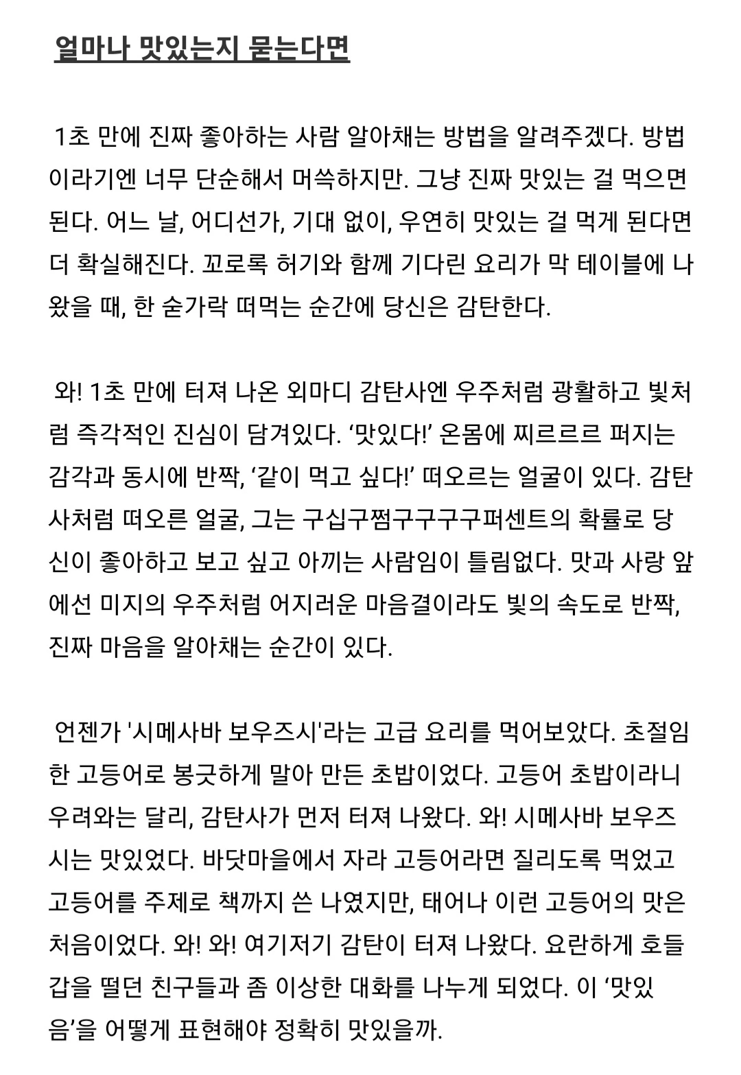 (...) 와! 1초 만에 터져 나온 외마디 감탄사엔 우주처럼 광활하고 빛처럼 즉각적인 진심이 담겨있다. ‘맛있다!’ 온몸에 찌르르르 퍼지는 감각과 동시에 반짝, ‘같이 먹고 싶다!’ 떠오르는 얼굴이 있다. 감탄사처럼 떠오른 얼굴, 그는 구십구쩜구구구구퍼센트의 확률로 당신이 좋아하고 보고 싶고 아끼는 사람임이 틀림없다. 맛과 사랑 앞에선 미지의 우주처럼 어지러운 마음결이라도 빛의 속도로 반짝, 진짜 마음을 알아채는 순간이 있다.