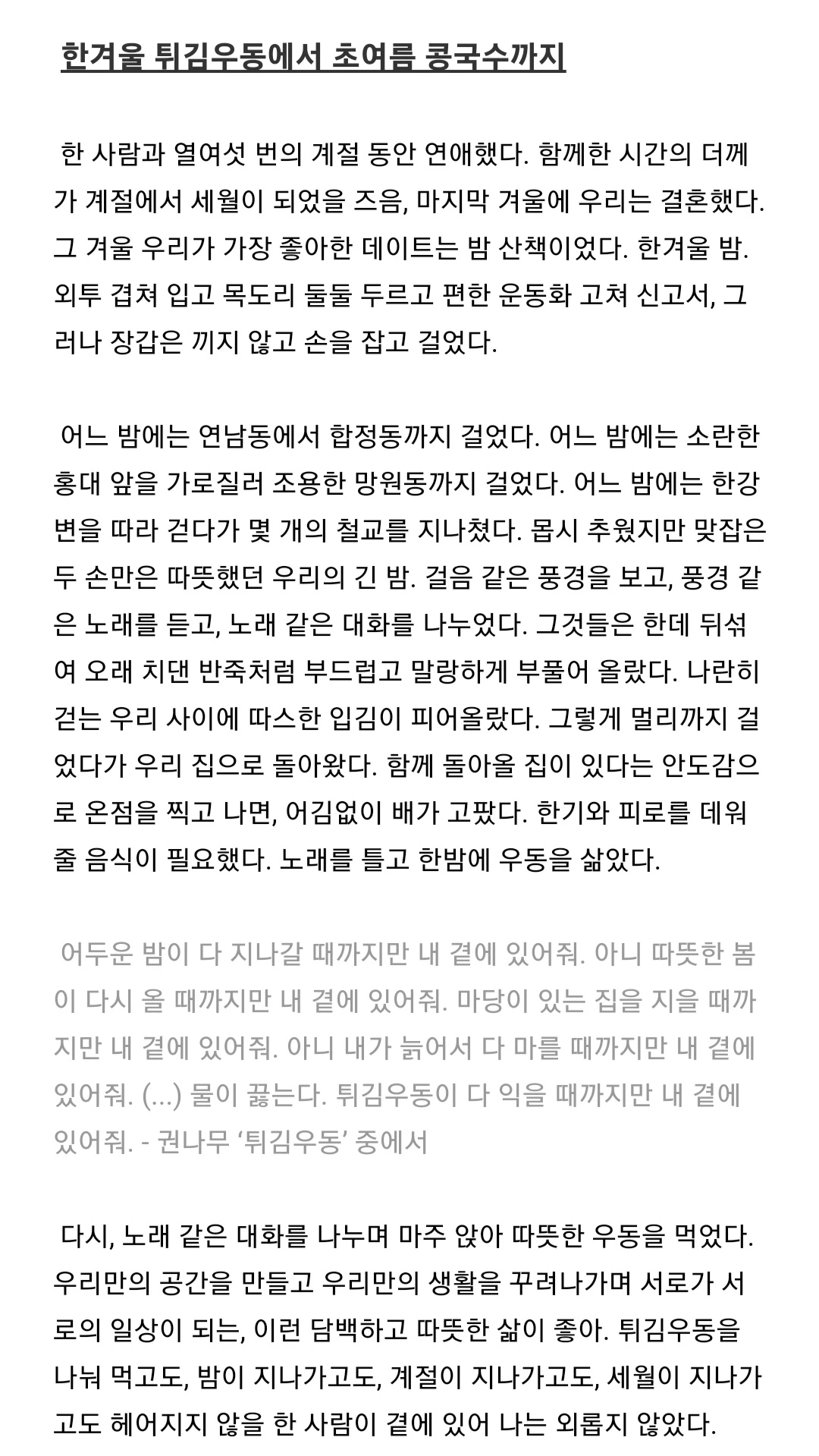 우리는 몇 번의 계절 동안 사랑할까. 튀김우동 끓여 먹던 한겨울을 지나 콩국수 들이켜는 초여름이 되었어도, 우리에겐 여전히 긴 삶이 남아있다. 걸음 같은 풍경을 보고, 풍경 같은 노래를 듣고, 노래 같은 대화를 나누는, 그런 평범한 날들이 이어지고 이어진다. 돌돌돌 실타래를 감아가듯 이런 느슨하고 부드러운 삶이 좋아. 콩국수를 나눠 먹고도, 저녁이 지나가고도, 계절이 지나가고도, 세월이 지나가고도 헤어지지 않을 사람들이 곁에 있다. 나는 외롭지 않다.