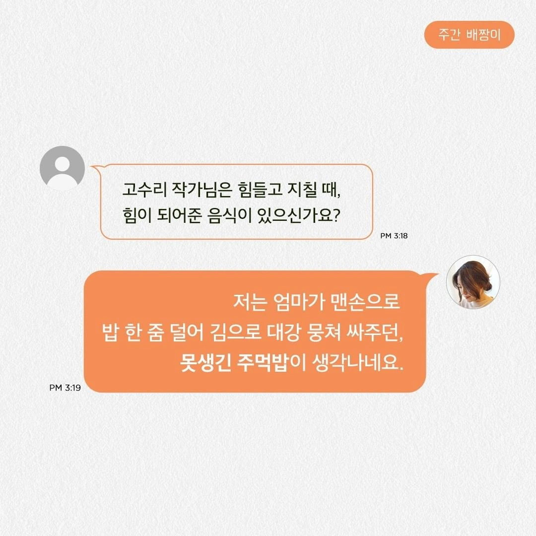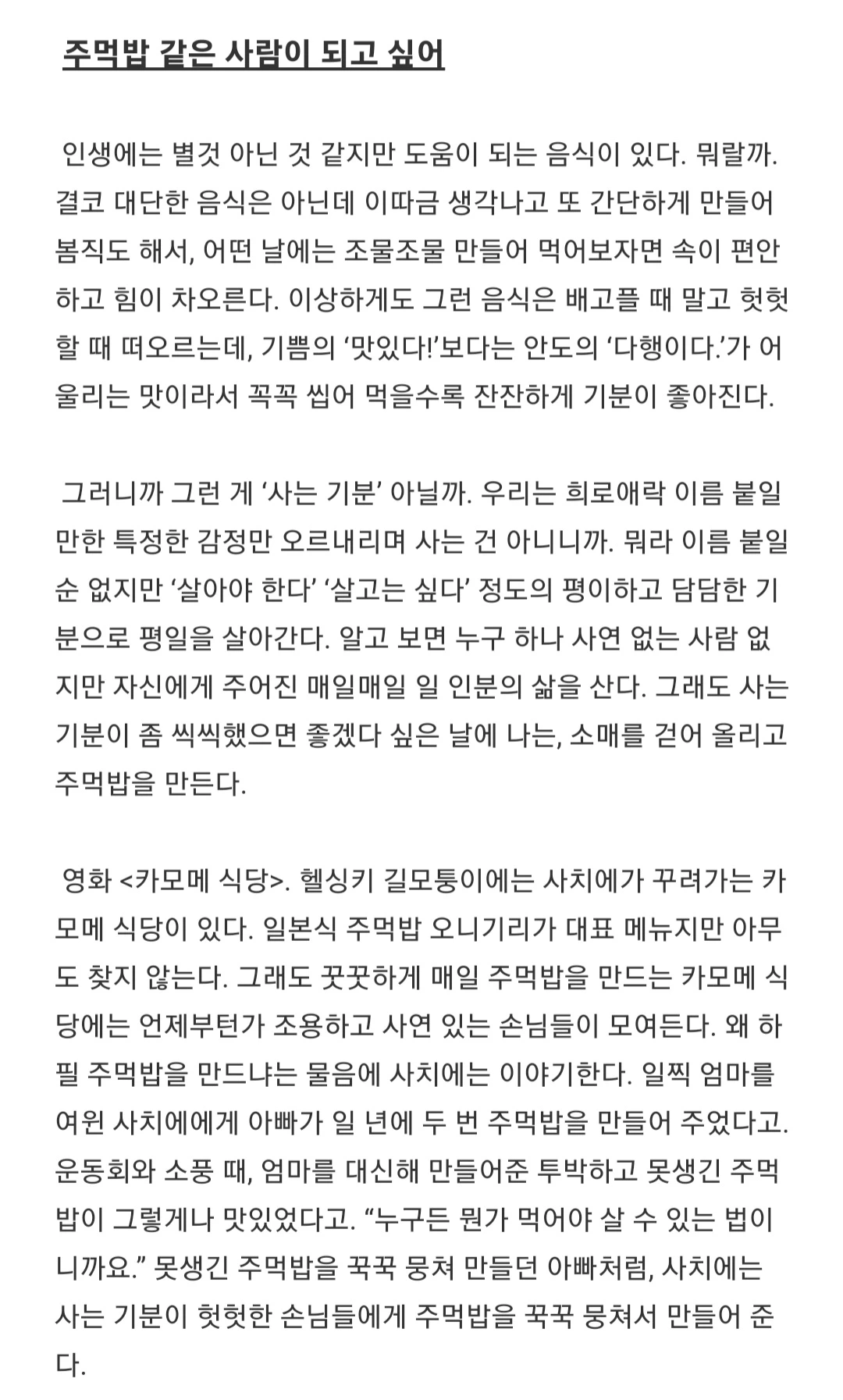 (...) “누구든 뭔가 먹어야 살 수 있는 법이니까요.” 주먹밥을 뭉치는 사치에를, “너무 애쓰지 마라. 다 먹고 살자고 사는 거니까.” 주먹밥을 뭉치는 엄마를 떠올린다. 별것 아닌 것 같지만 도움이 되는 주먹밥. 단순하고 단단하고 씩씩하고 못생긴 주먹밥을 꾹꾹 뭉쳐 다지며 다짐한다. 주먹밥 같은 사람이 되고 싶어.
