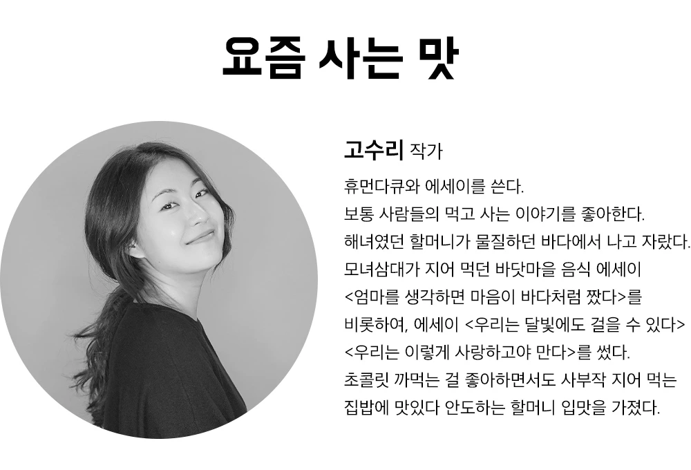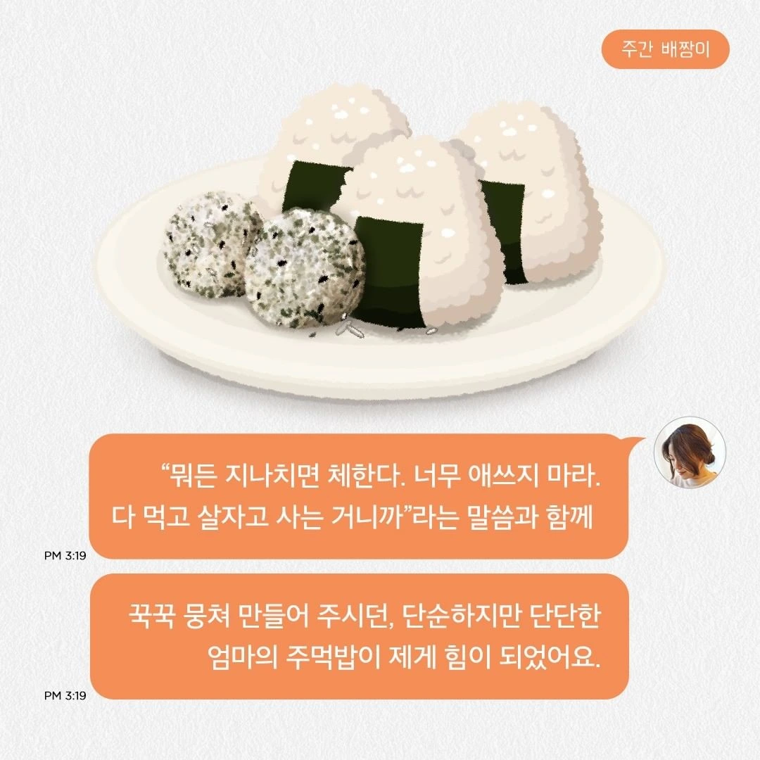그러니까 그런 게 ‘사는 기분’ 아닐까. 우리는 희로애락 이름 붙일 만한 특정한 감정만 오르내리며 사는 건 아니니까. 뭐라 이름 붙일 순 없지만 ‘살아야 한다’ ‘살고는 싶다’ 정도의 평이하고 담담한 기분으로 평일을 살아간다. 알고 보면 누구 하나 사연 없는 사람 없지만 자신에게 주어진 매일매일 일 인분의 삶을 산다. 그래도 사는 기분이 좀 씩씩했으면 좋겠다 싶은 날에 나는, 소매를 걷어 올리고 주먹밥을 만든다.
