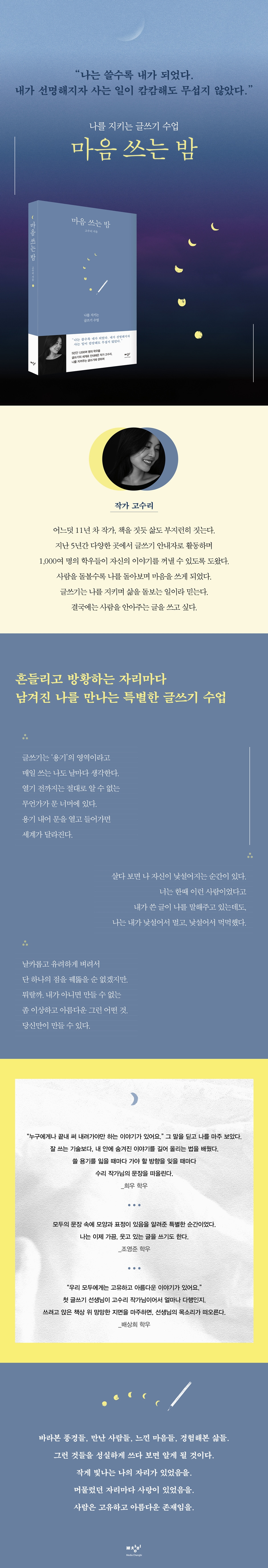 나도 필요한 누군가 읽어주길 바라며 책을 썼다. 내가 쓴 이 책은 어딘가로 떠나버리는 것이 아니라, 독자에게 돌아간다고 믿는다. 이 책에도 귀소본능이 있어서 어울리는 독자를 잘 찾아가길 바란다. 그가 이 책을 읽고 자기만의 글을 쓴다면 더할 나위 없이 좋겠다. 무언가 쓰려는 당신에게 꼭 필요할 테니 안아주는 마음을 담아 보낸다. - [마음 쓰는 밤] 프롤로그
