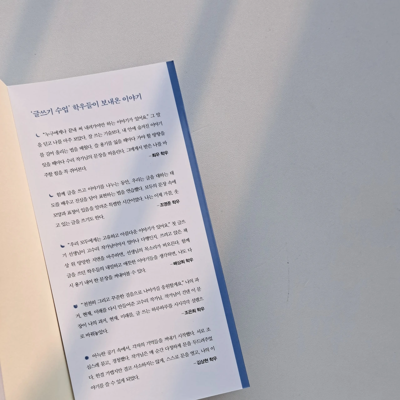 휴먼다큐와 에세이를 쓰기 시작해 어느덧 11년 차 작가가 되었습니다. 한 번쯤 글 쓰는 마음과 글 쓰며 만난 사람들의 이야기를 책에 담아보고 싶었어요. 글쓰기는 흔들릴 때마다 저를 지켜주었고, 글쓰기 수업은 내가 아닌 다른 사람이 되어 살아보도록 때때로 저를 겸허하게 만들어 주었습니다.